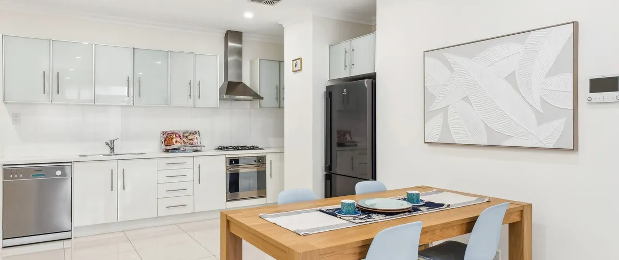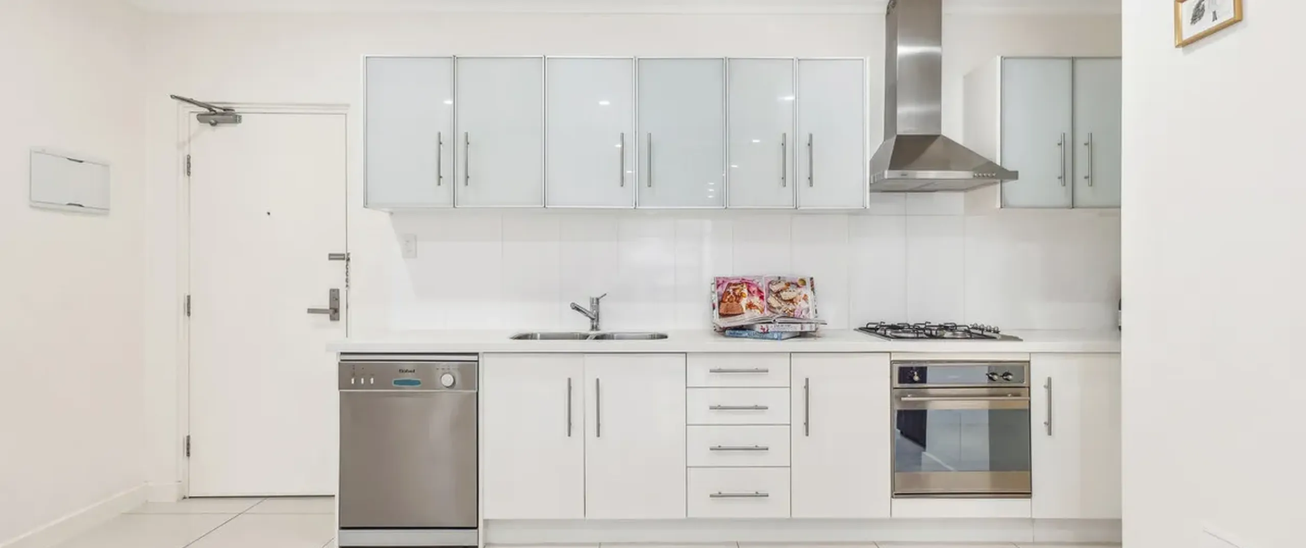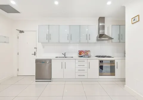 - Modern kitchen equipped with stainless steel appliances, a sleek benchtop, and stylish glass overhead cabinets