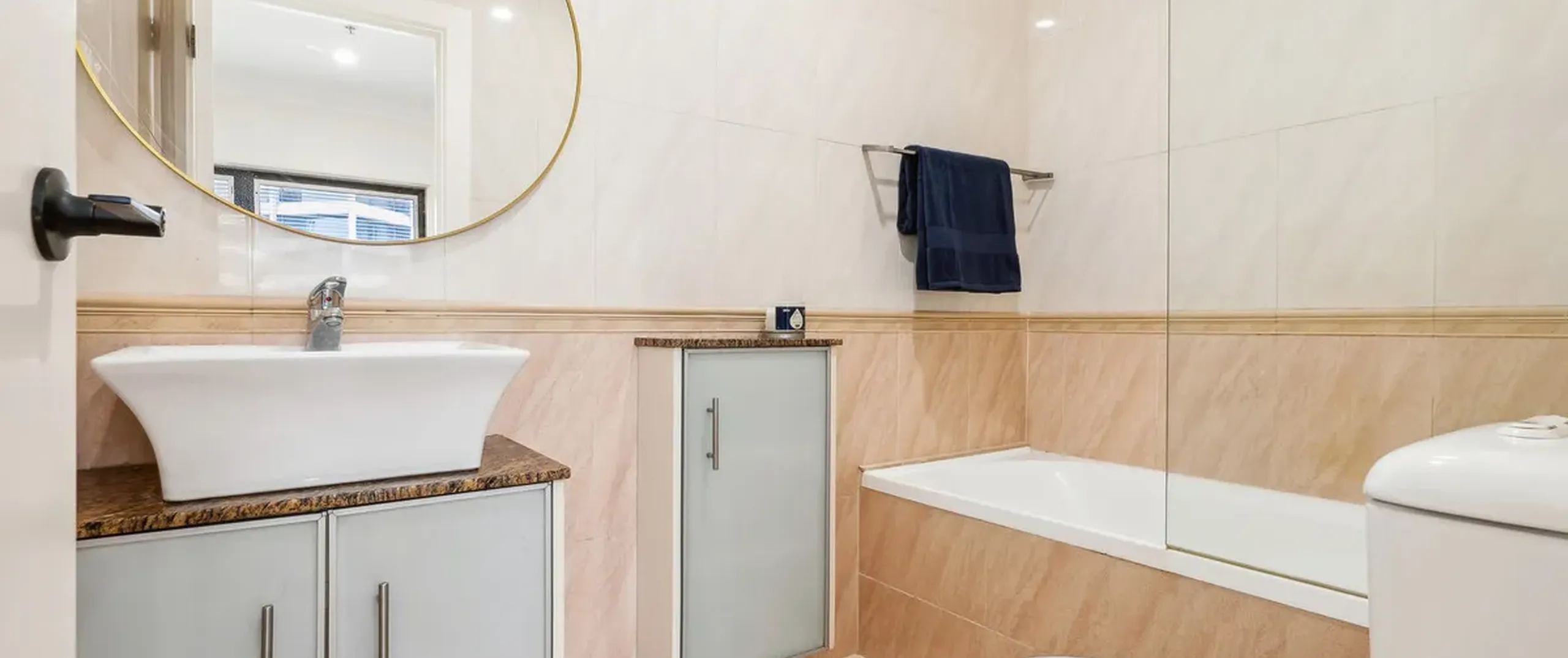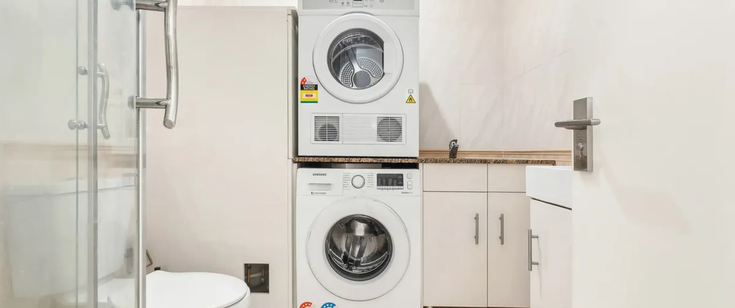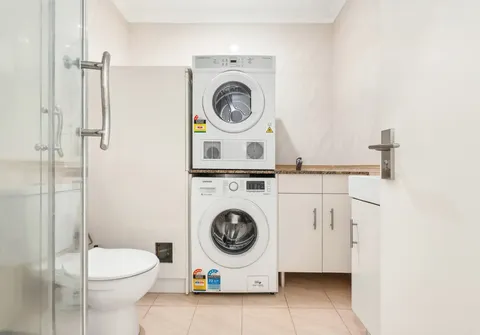 - Main bathroom with laundry facilities, featuring floor to ceiling tiles