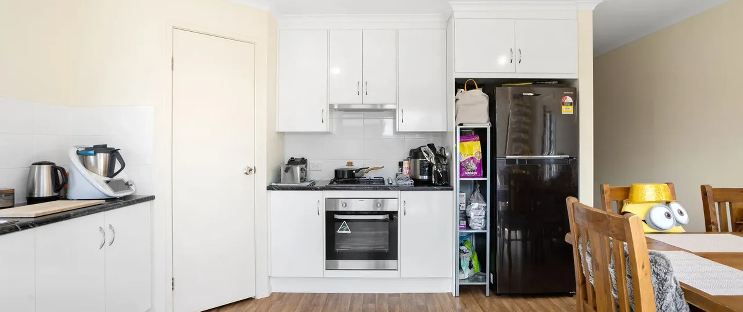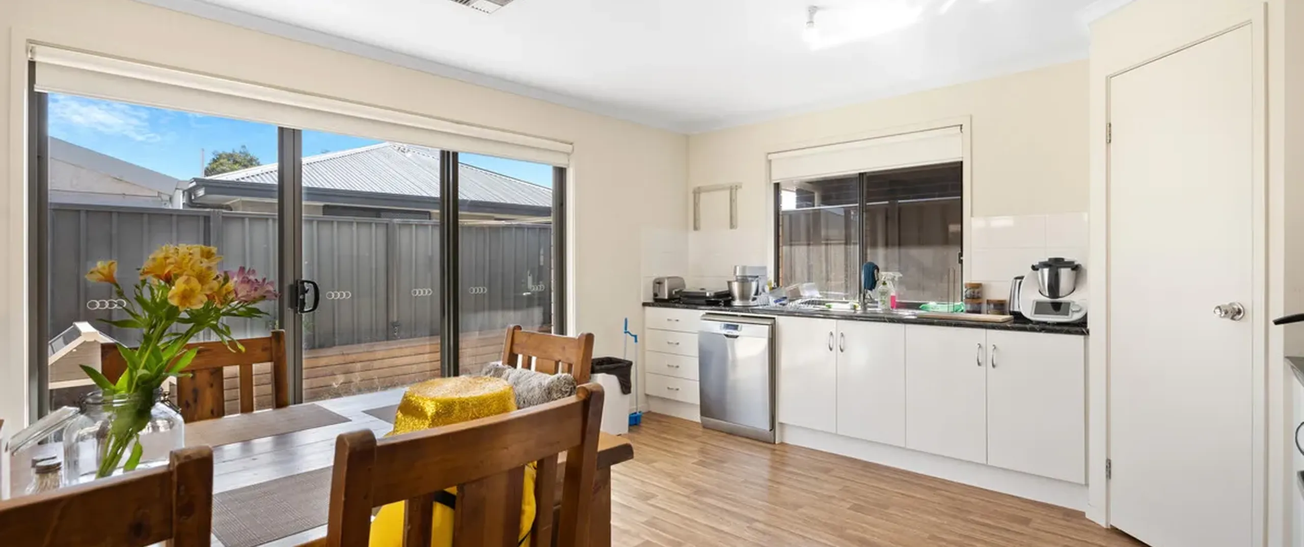 - Light filled open plan dine-in kitchen boasting stainless steel appliances including gas cooktop, dishwasher, ample bench and cupboard space including a walk-in pantry