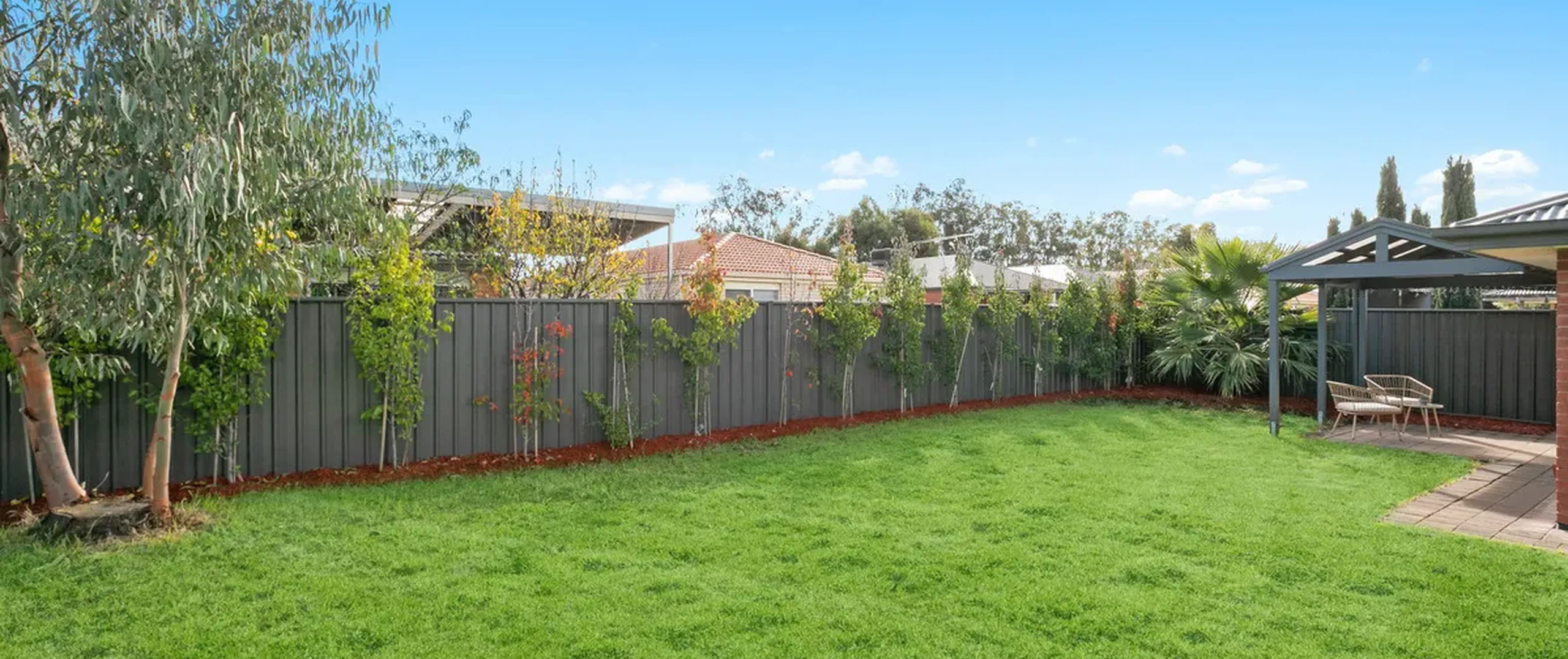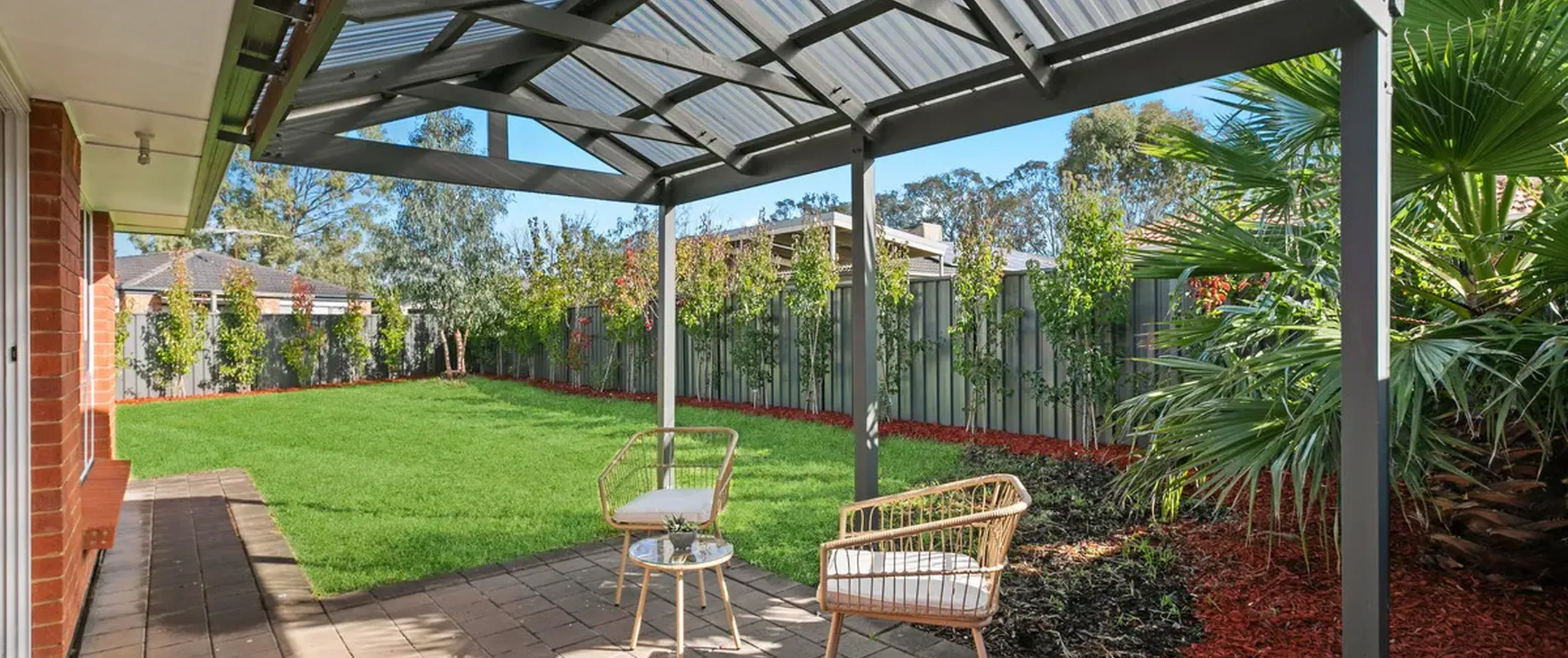 - Paved outdoor entertaining area with pitched roof pergola