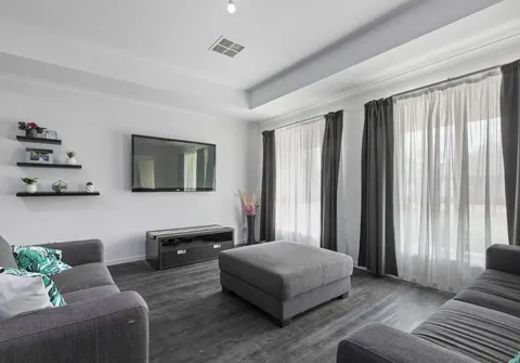 - Generous formal living and dining room upon entry boasting recessed ceiling and two large windows