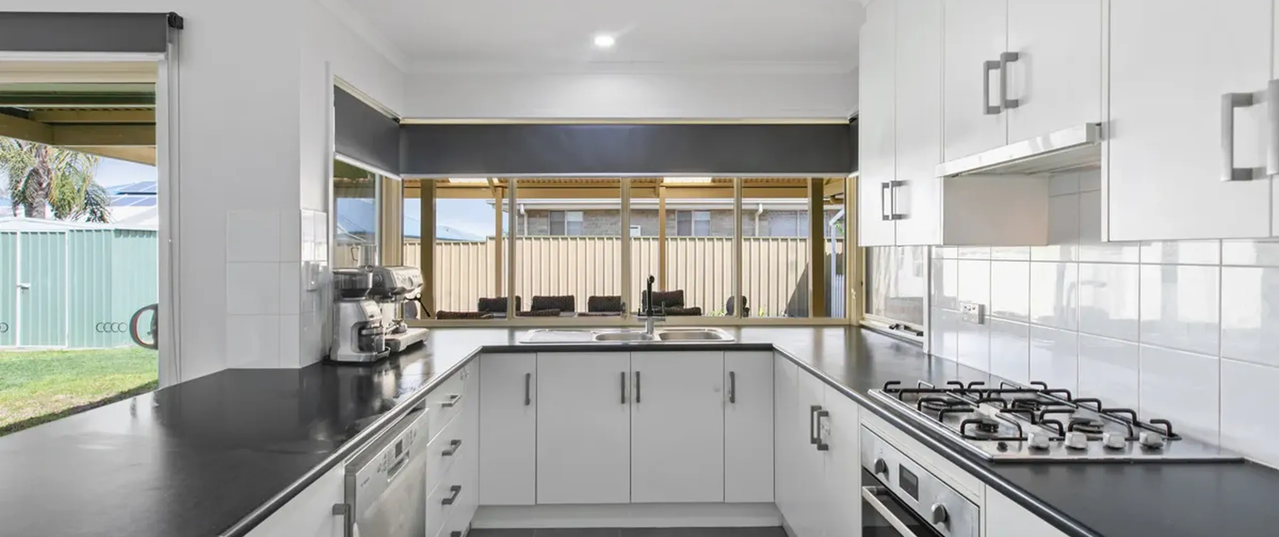 - Contemporary kitchen with stainless steel dishwasher, oven and gas cooktop, walk-in pantry, ample cupboard and bench space, featuring breakfast bar