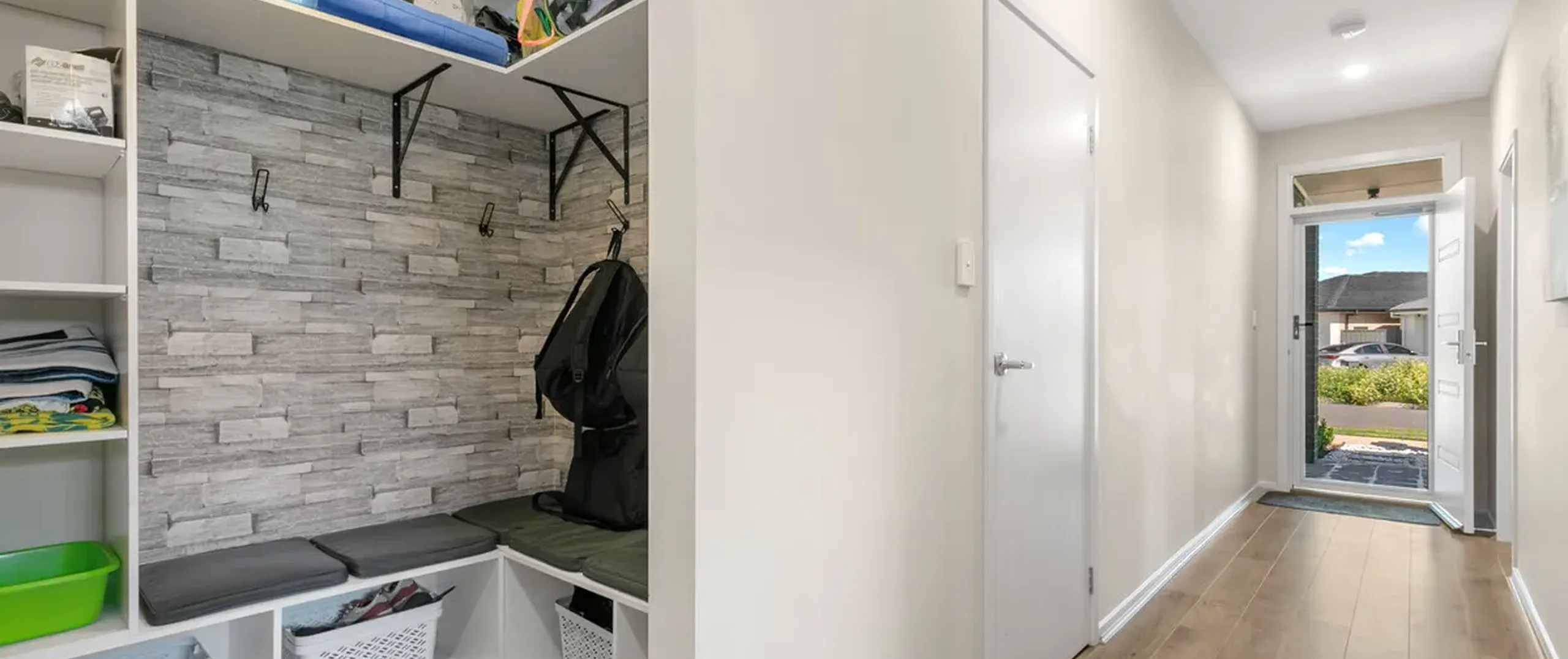 - Laundry with built-in cupboards, wall mounted indoor washing line and external access