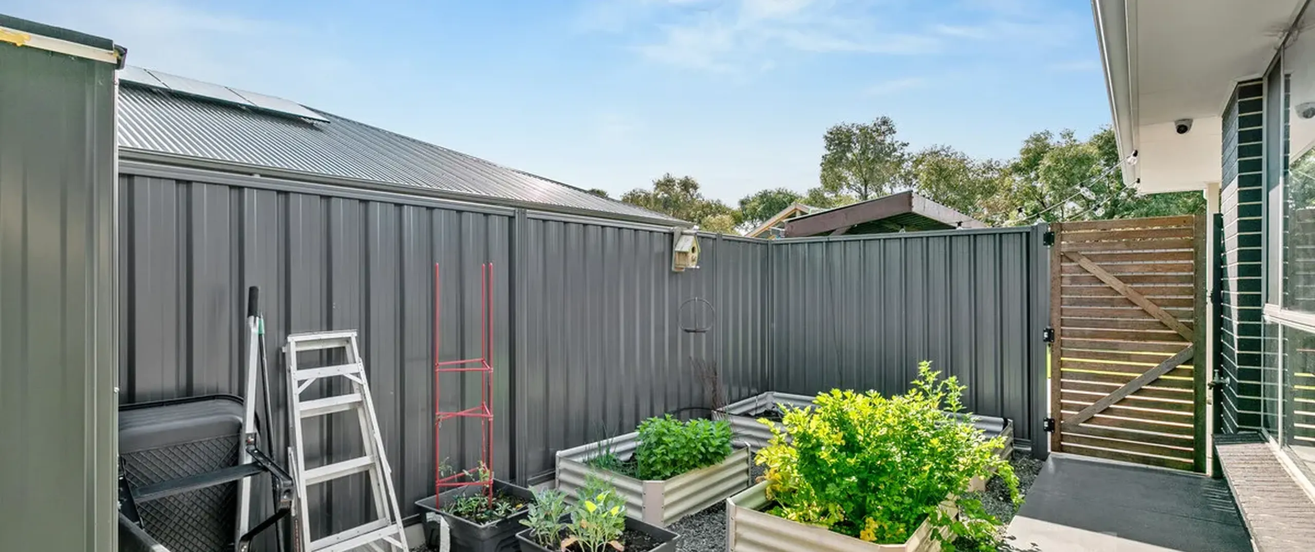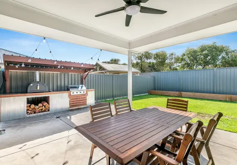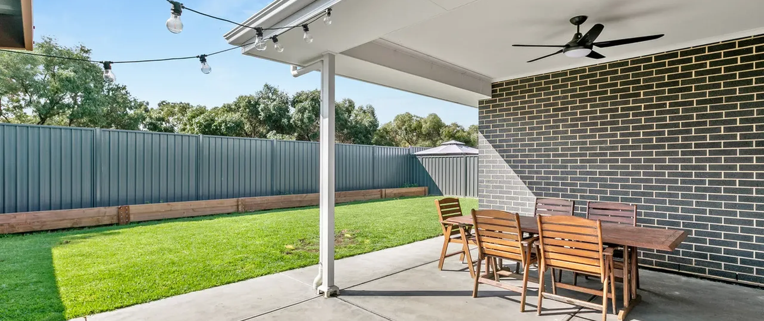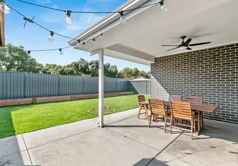 - Spacious alfresco under the main roof with ceiling fan and included Jarrah outdoor table setting for year-round comfort
