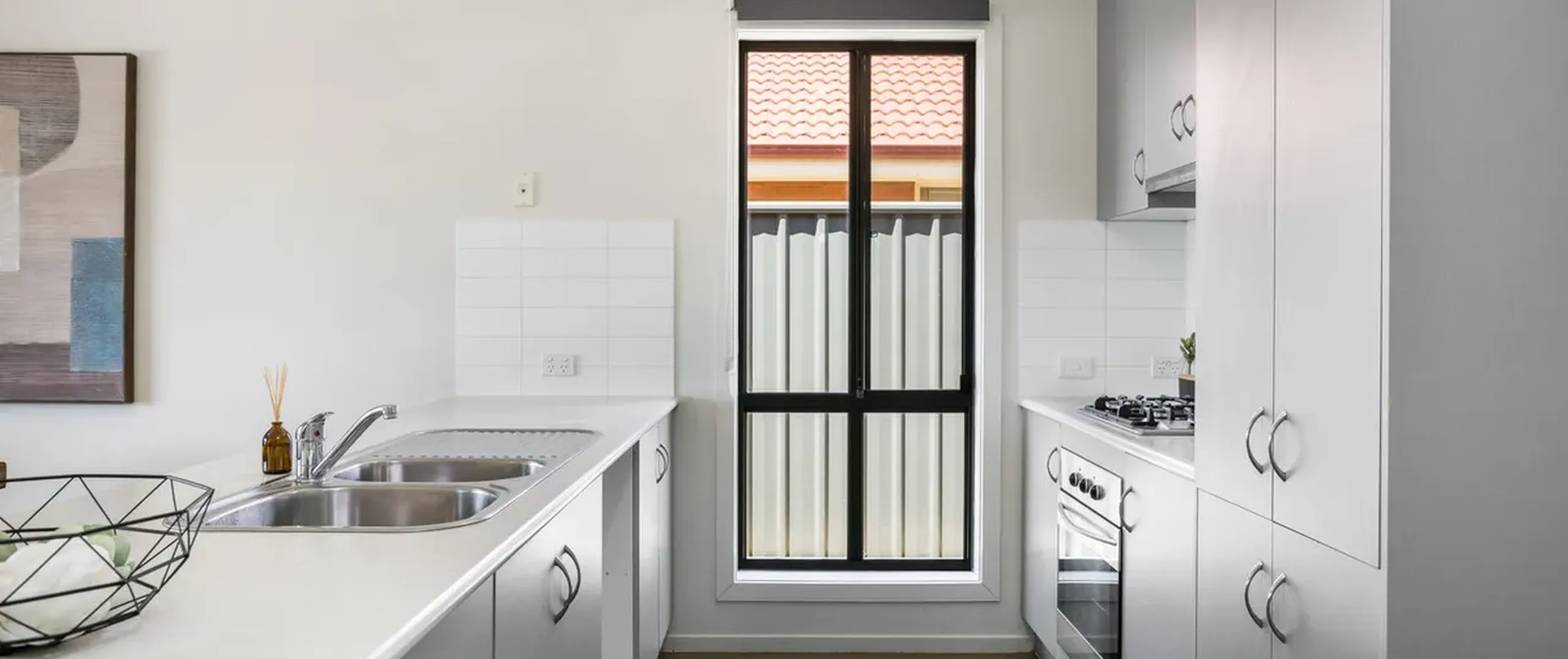 - Cool-toned timeless kitchen with stainless steel gas cooktop, ample cupboard and bench space