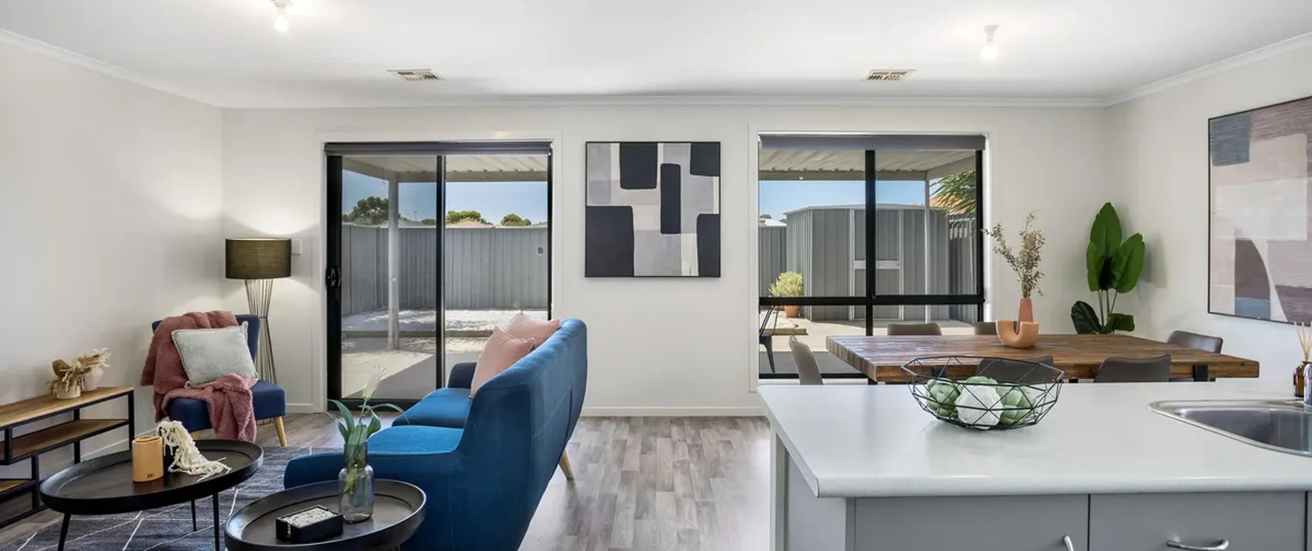 - Light-filled open-plan lounge and dining area with sliding doors opening to the verandah
