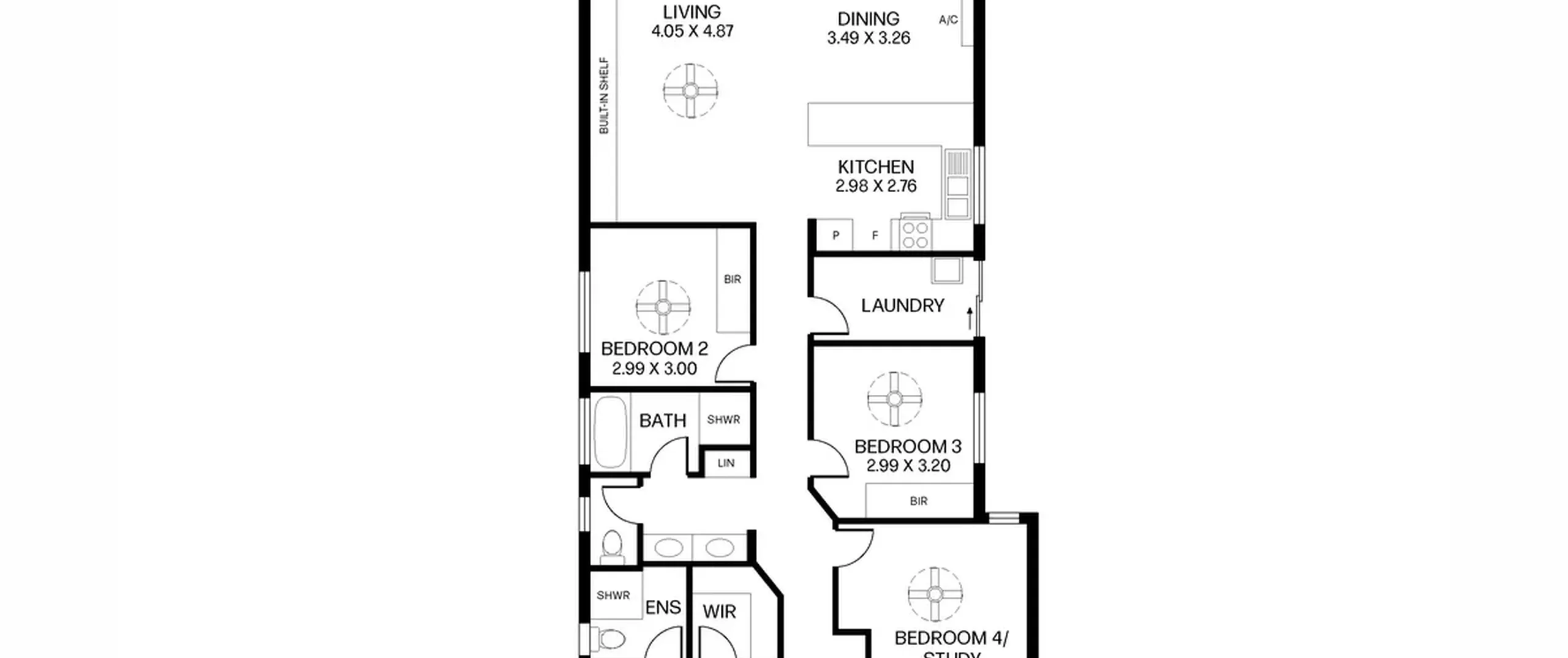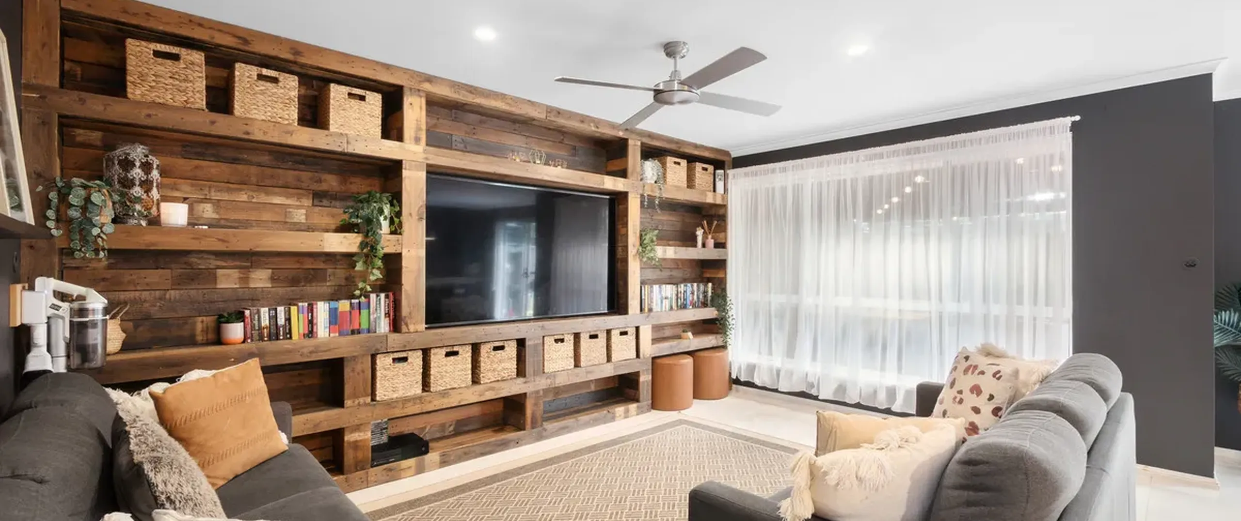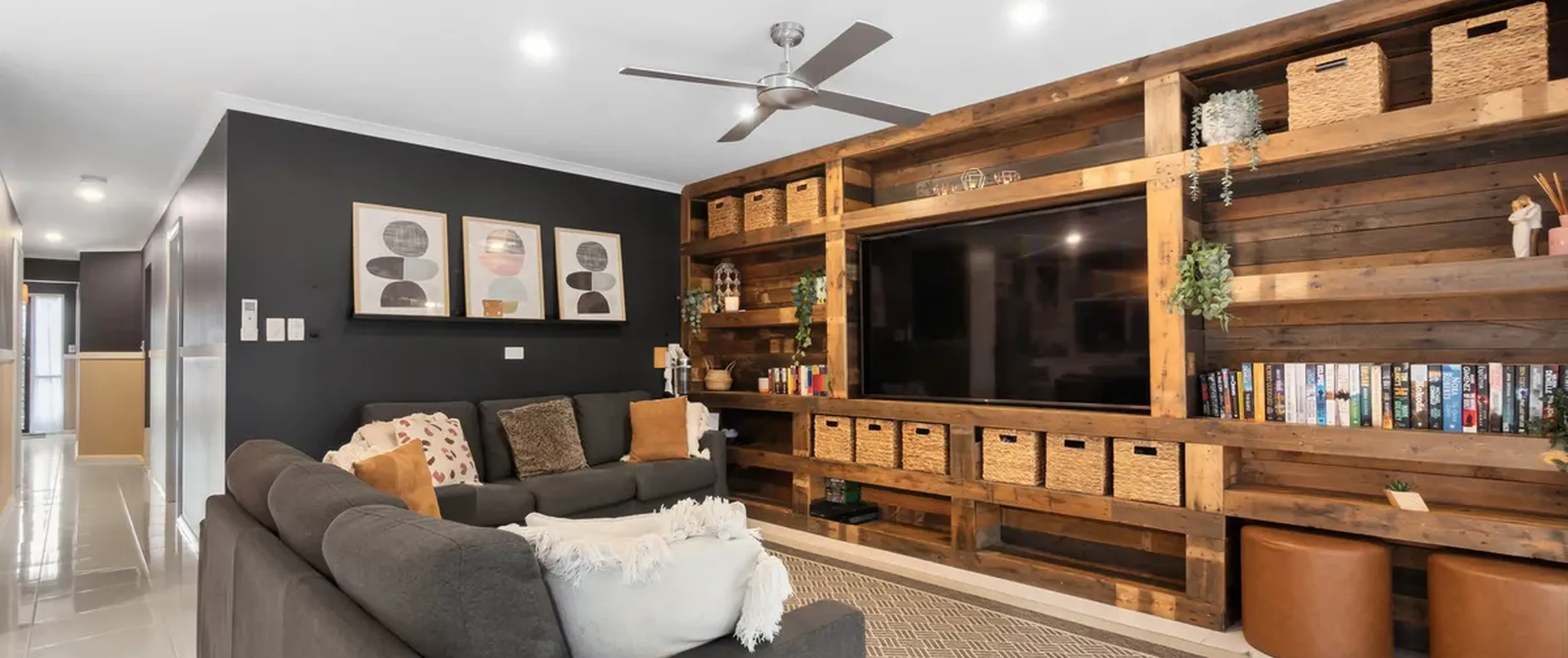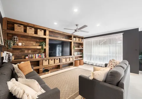 - Warm and inviting living area complete with built-in feature bookcase shelving, split system air-conditioning and ceiling fan