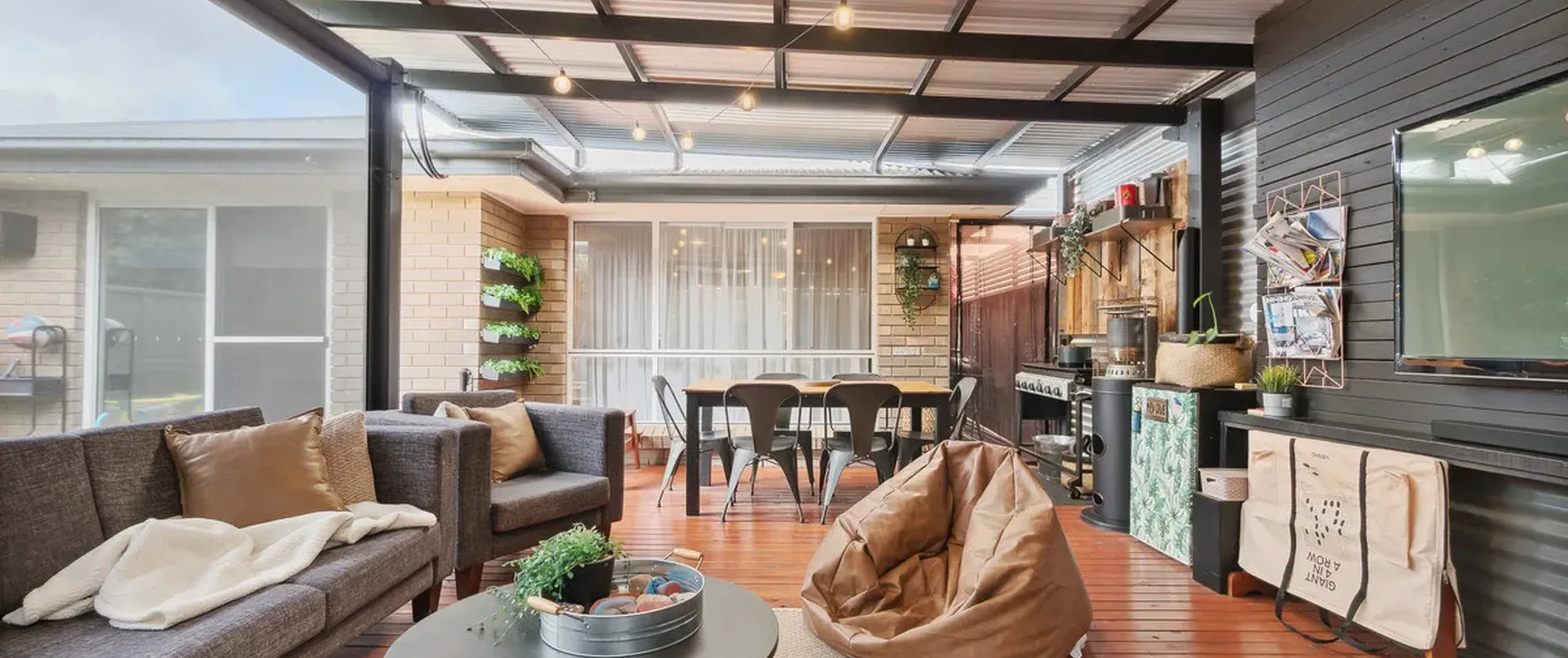 - Impressive, decked undercover outdoor entertaining area with pergola, ceiling fan and outdoor weather blinds