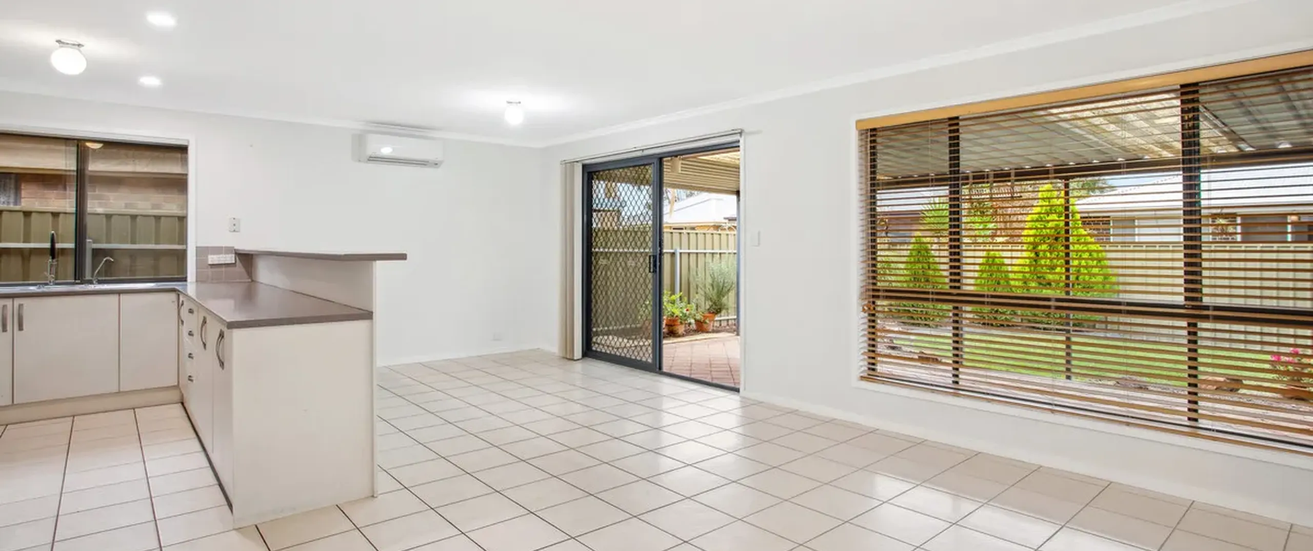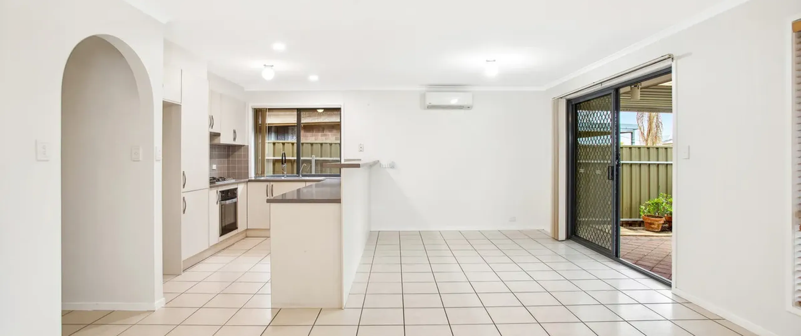- Open plan living, kitchen and dining with split system air conditioner and wall unit