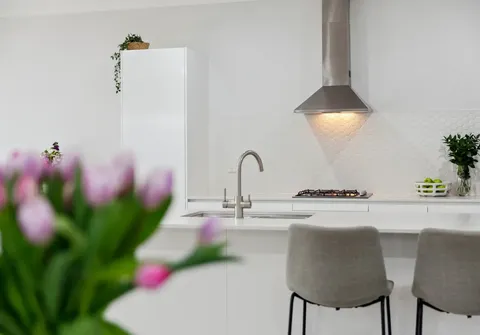 The expansive open-plan living space is perfect for family living and entertaining, featuring high 2.7m ceilings that create a sense of openness and airiness. Large windows and sheer floor-to-ceiling curtains allow natural light to flood the interiors. The kitchen is spacious and central, offering a modern design with ample storage and premium fixtures the avid home cook is sure to love.