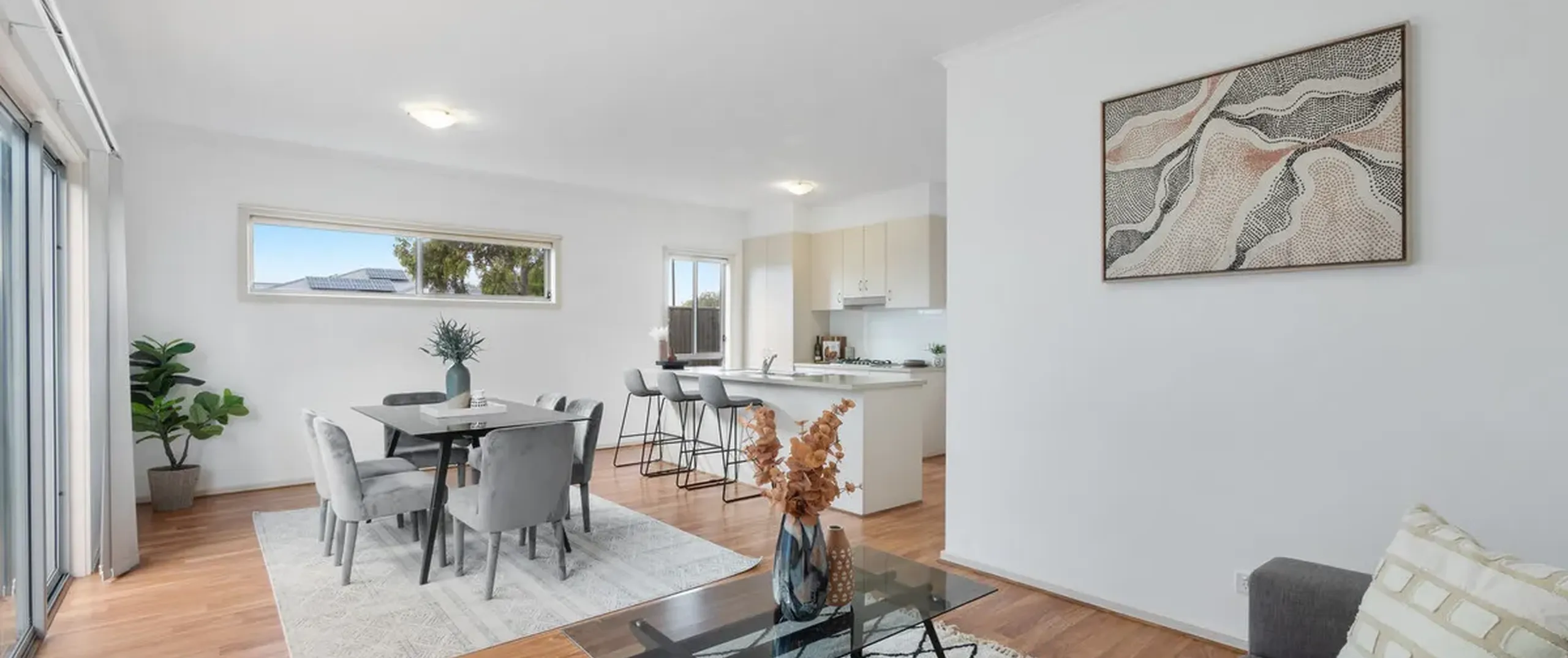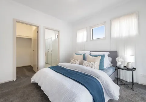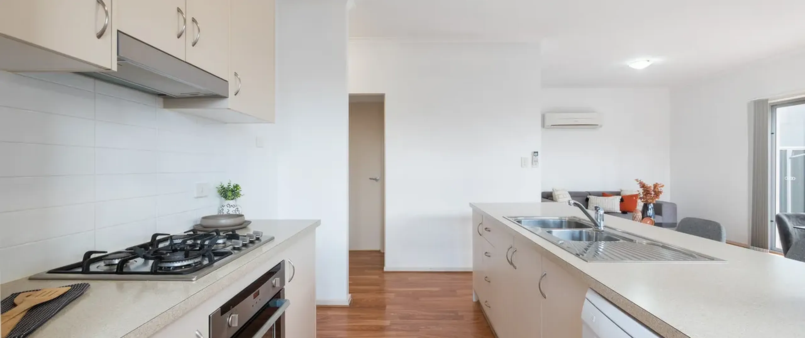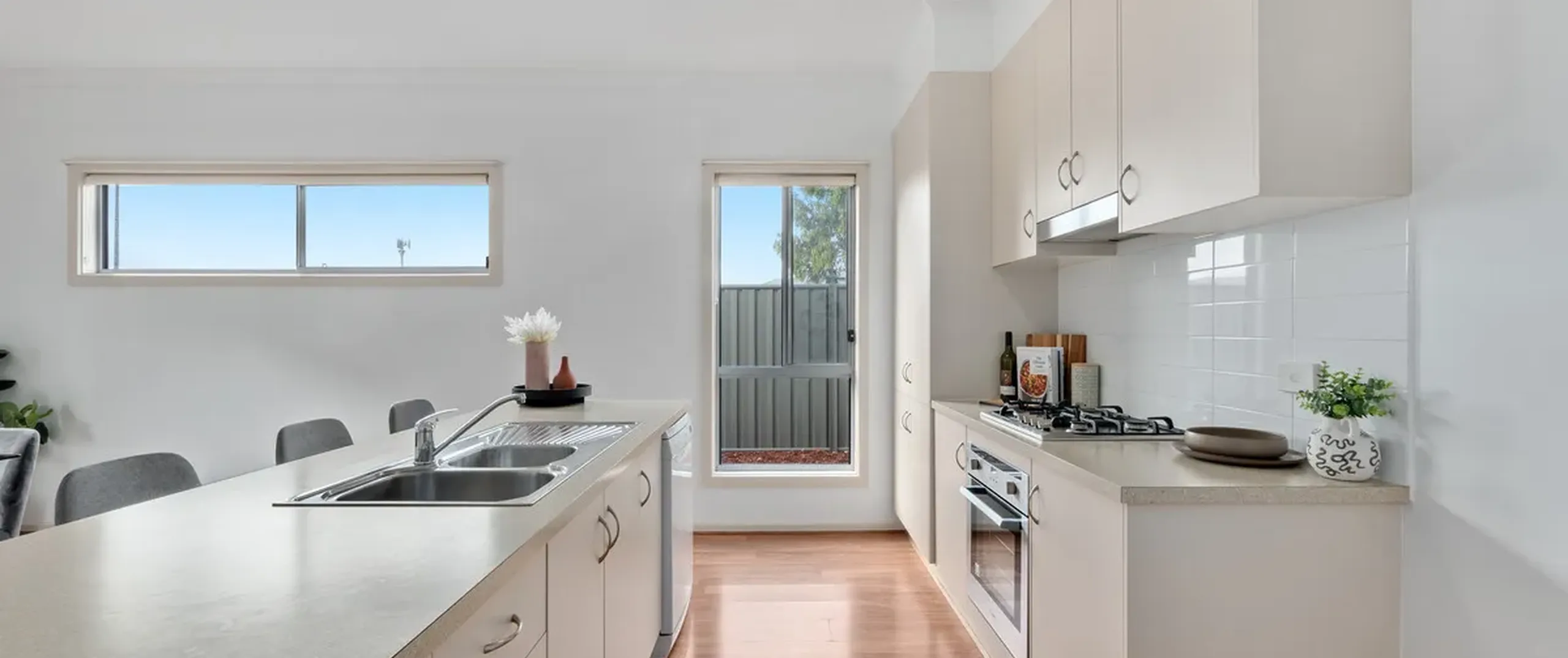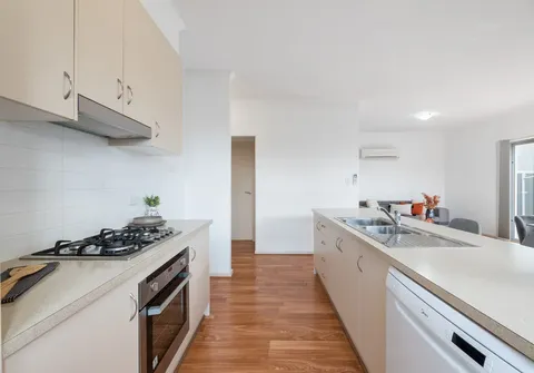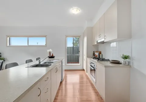 The layout spans over two levels with two bedrooms and a bathroom located upstairs and the main bedroom, with an ensuite and walk-in robe, set on the ground floor. The heart of the home is the light filled open-plan kitchen with gas cooking, dishwasher and an abundance of storage.