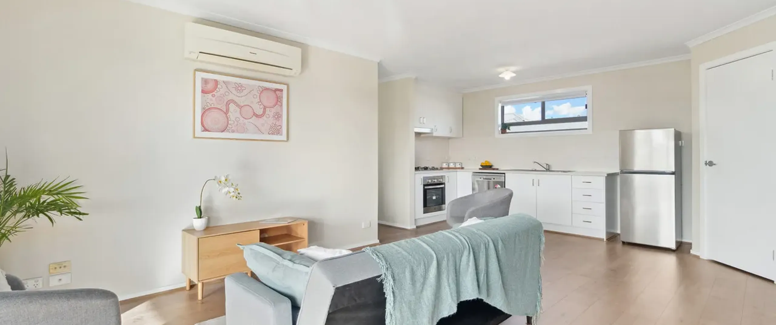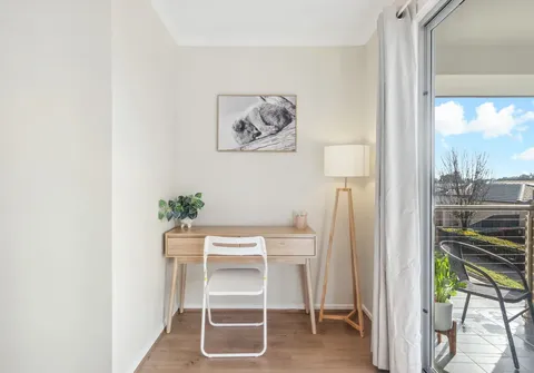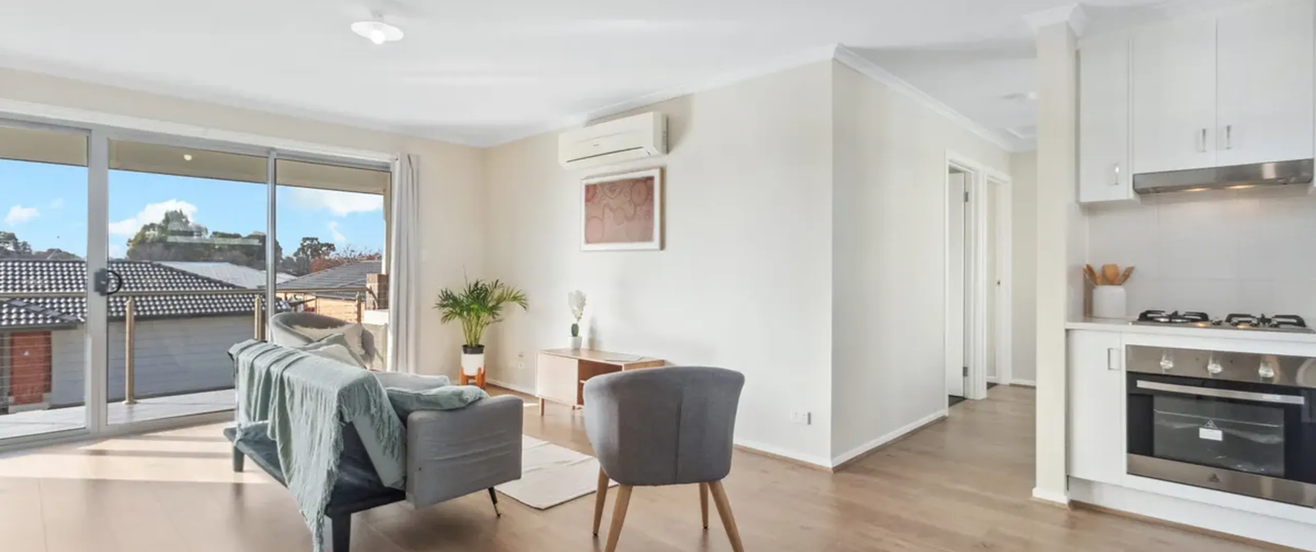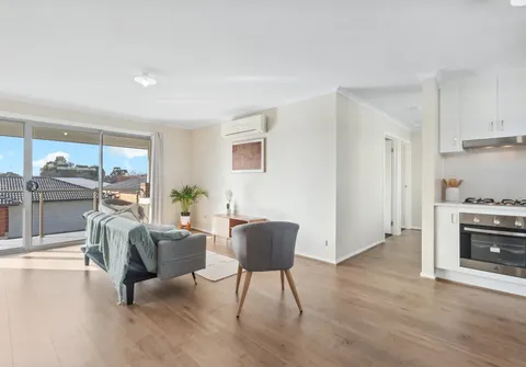 - Light-filled, open plan living and kitchen with split system reverse cycle air conditioner and sliding doors leading to the balcony