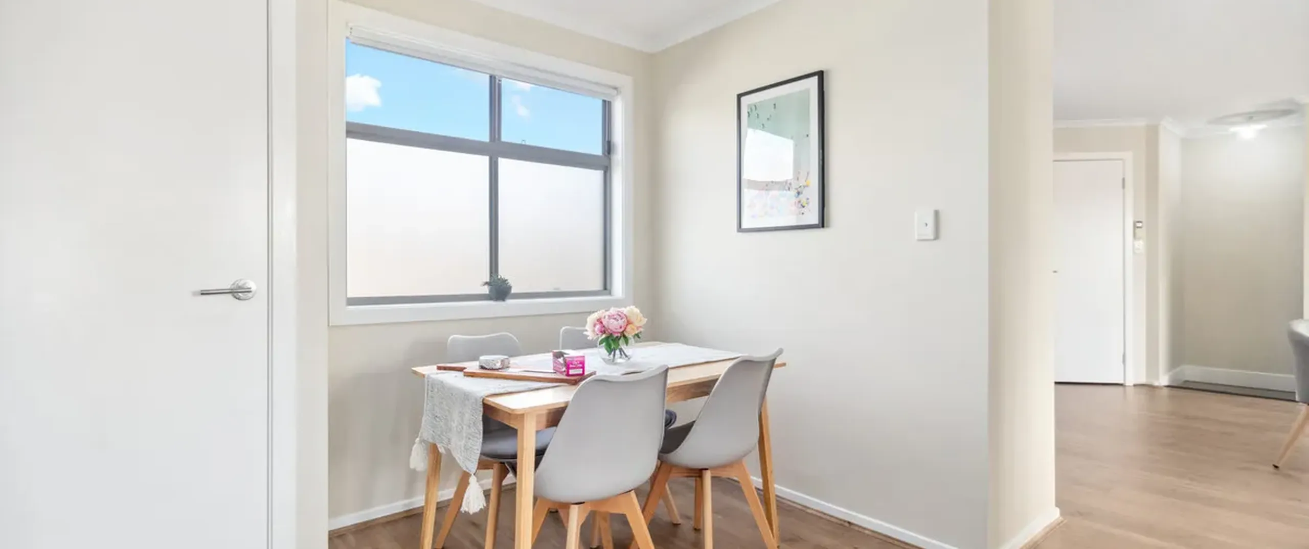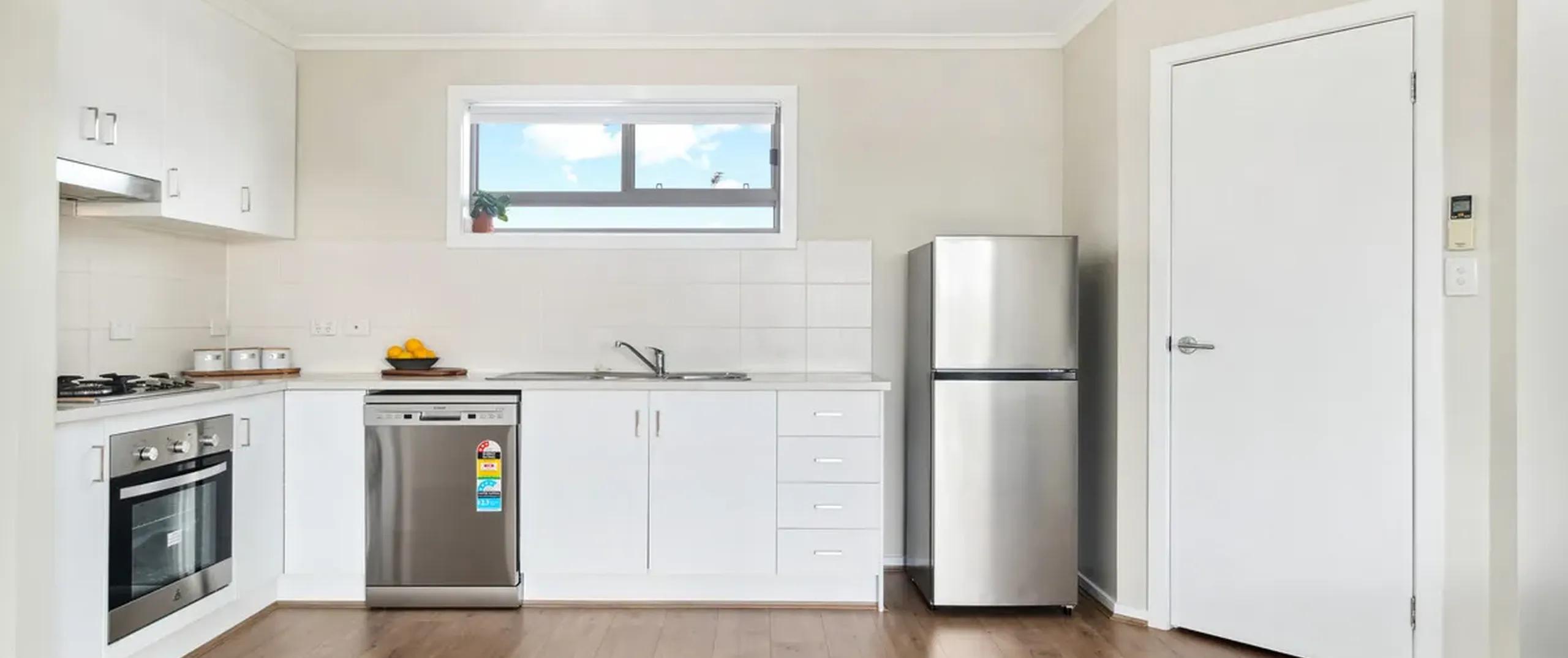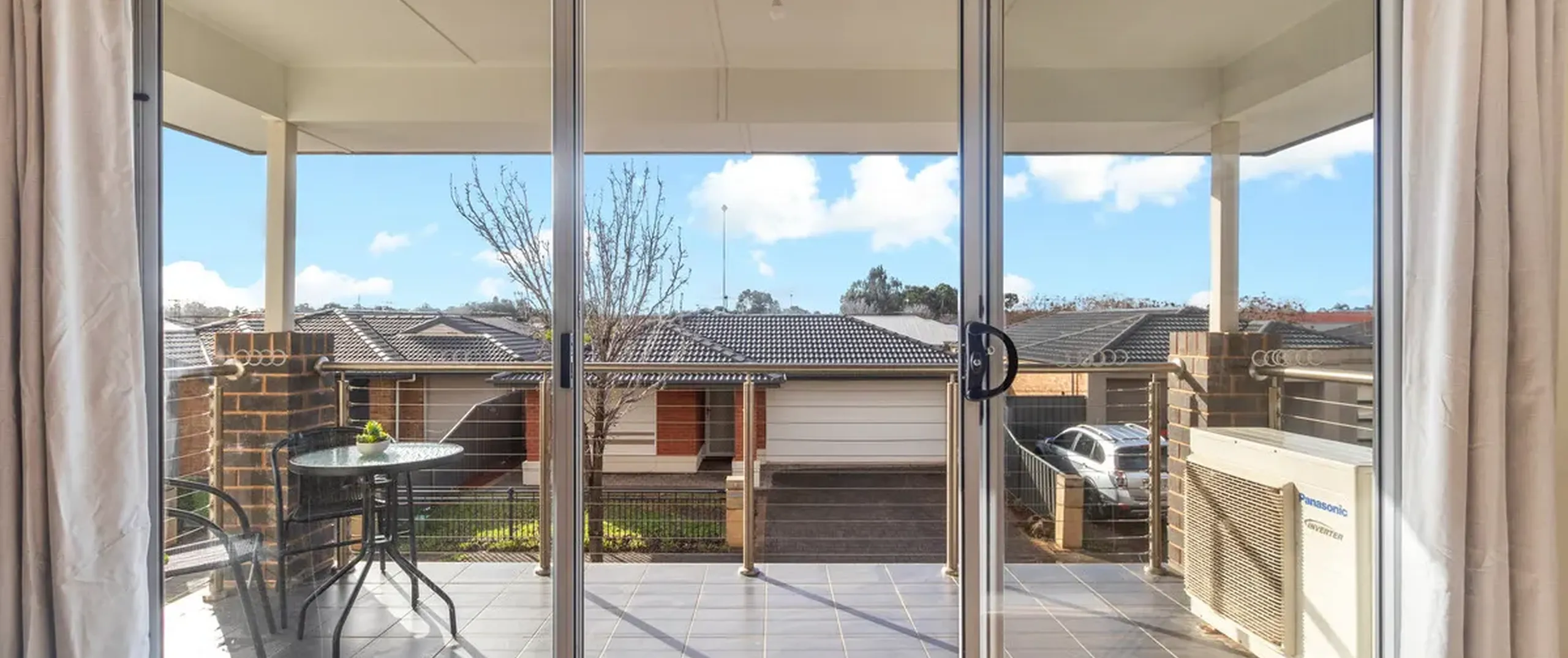 - Light-filled, open plan living and kitchen with split system reverse cycle air conditioner and sliding doors leading to the balcony