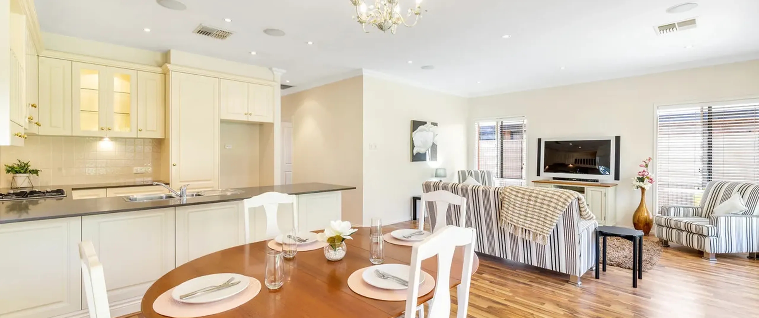 - Light-filled open plan living/dining and kitchen area with built-in speakers