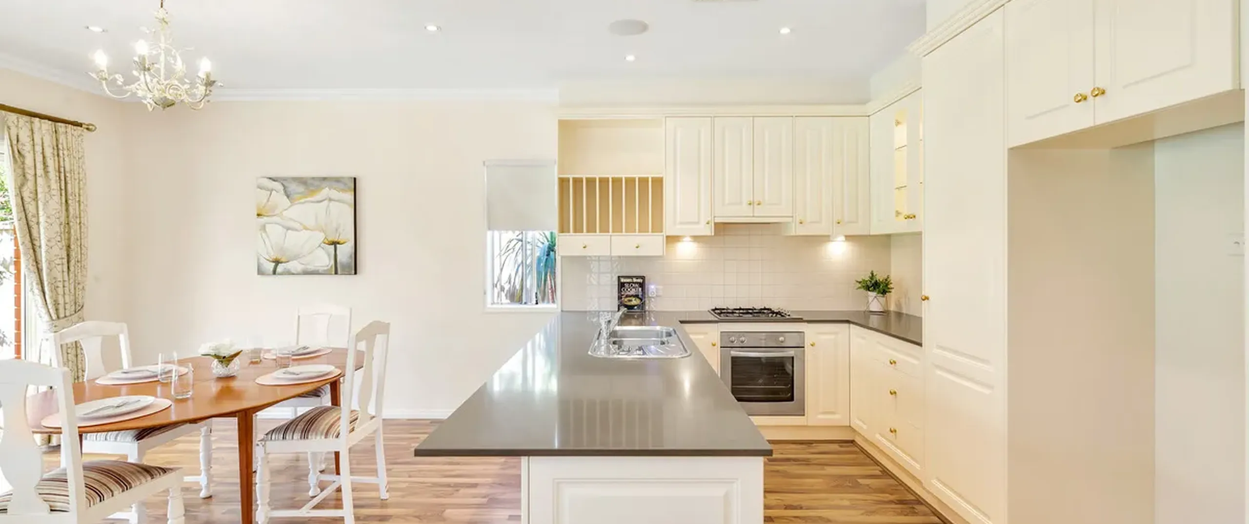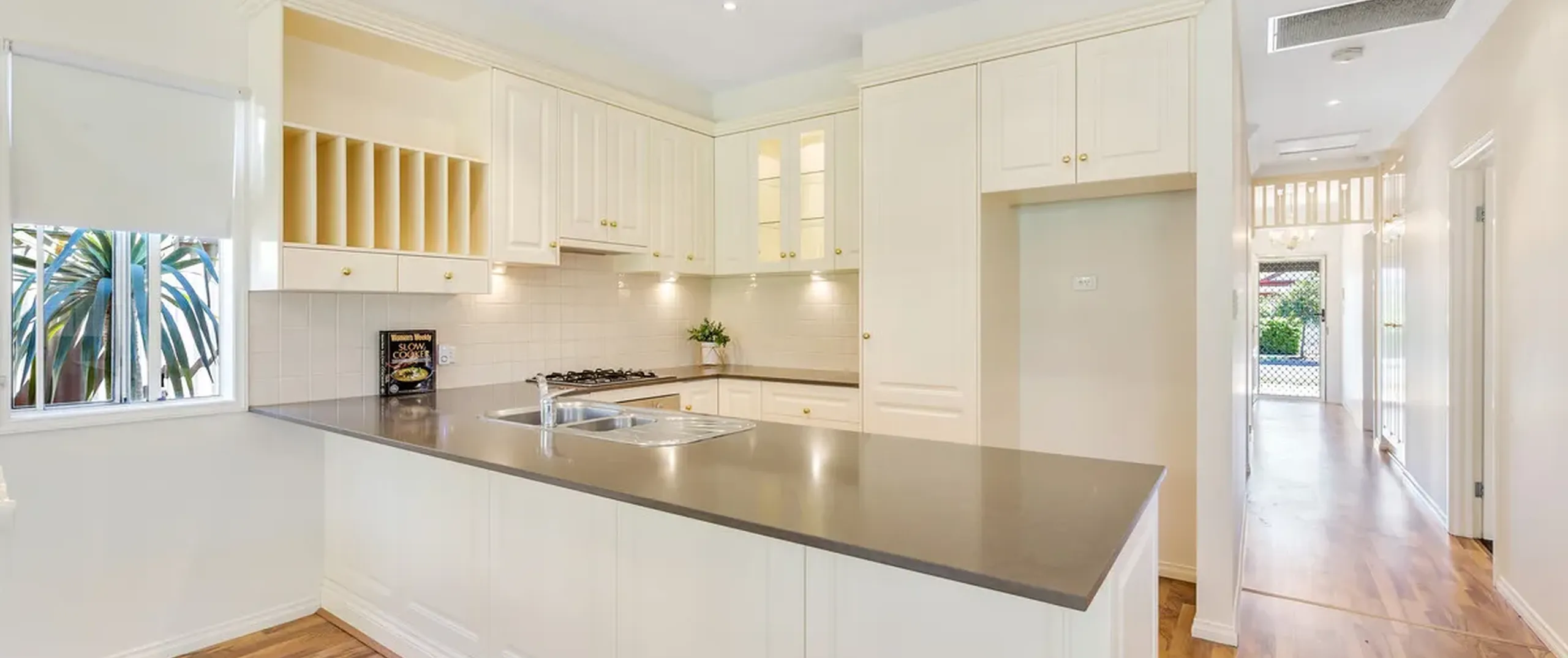 - Modern kitchen with stone benchtops, gas cooktop, Westinghouse dishwasher, breakfast bar and ample bench and cupboard space