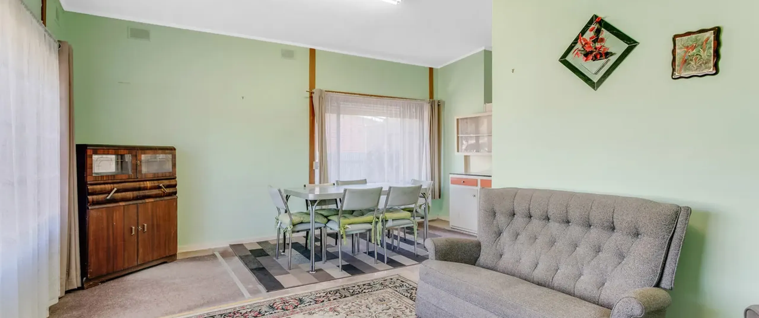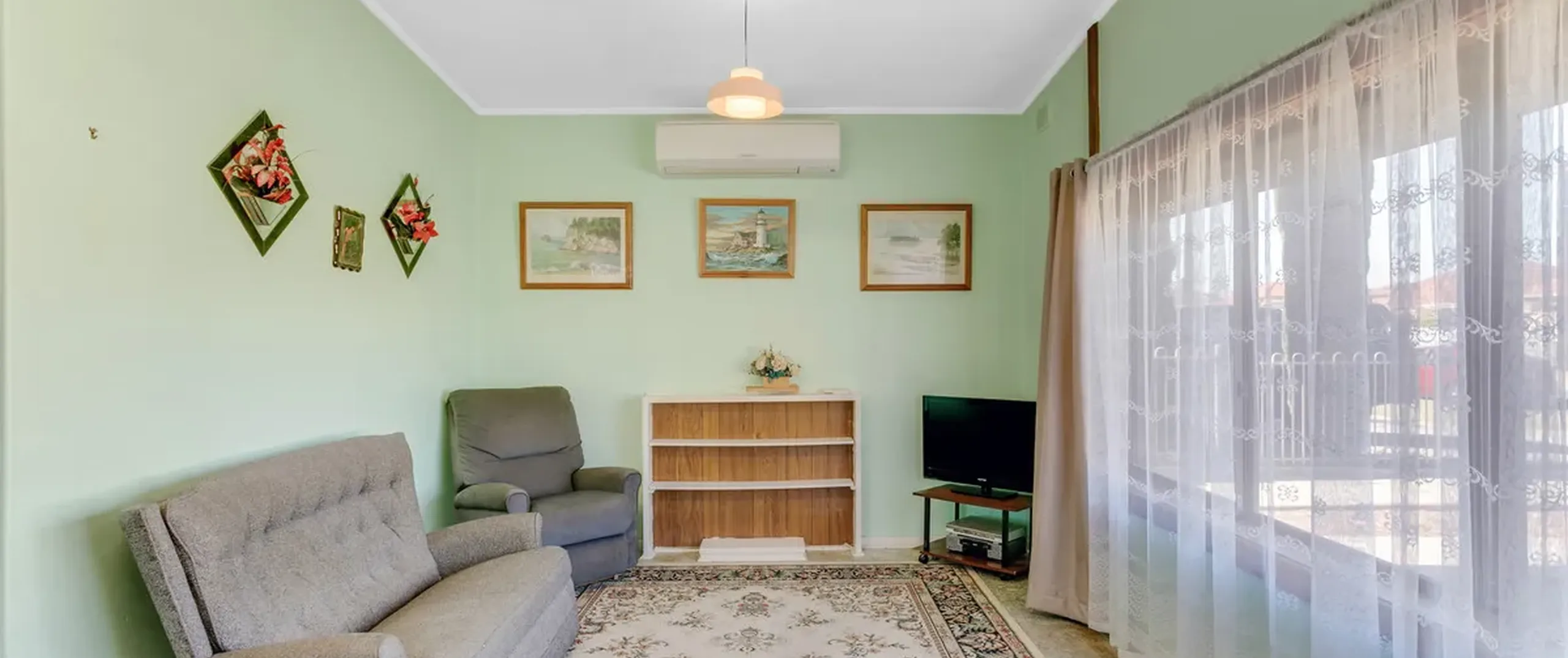 - Light-filled lounge and dining room upon entry with a split system air conditioner