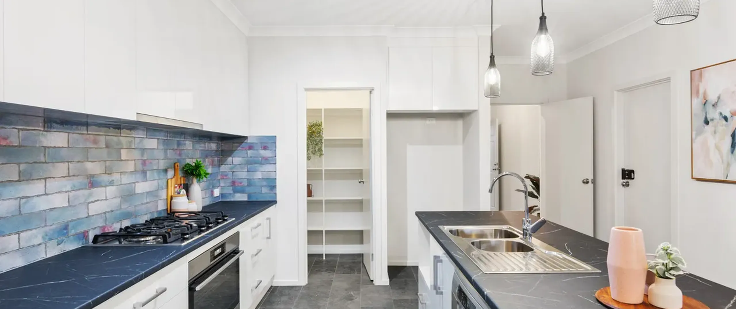 - Stylish kitchen with stainless steel appliances including gas cooktop, oven and dishwasher, walk-in pantry, ample cupboard space and island bench with breakfast bar