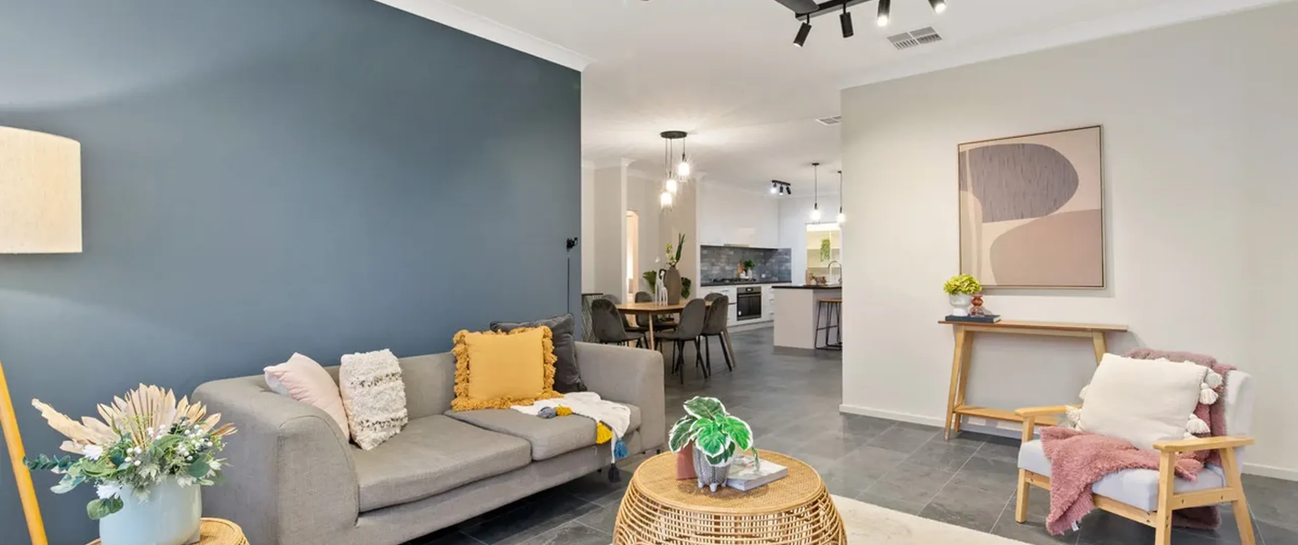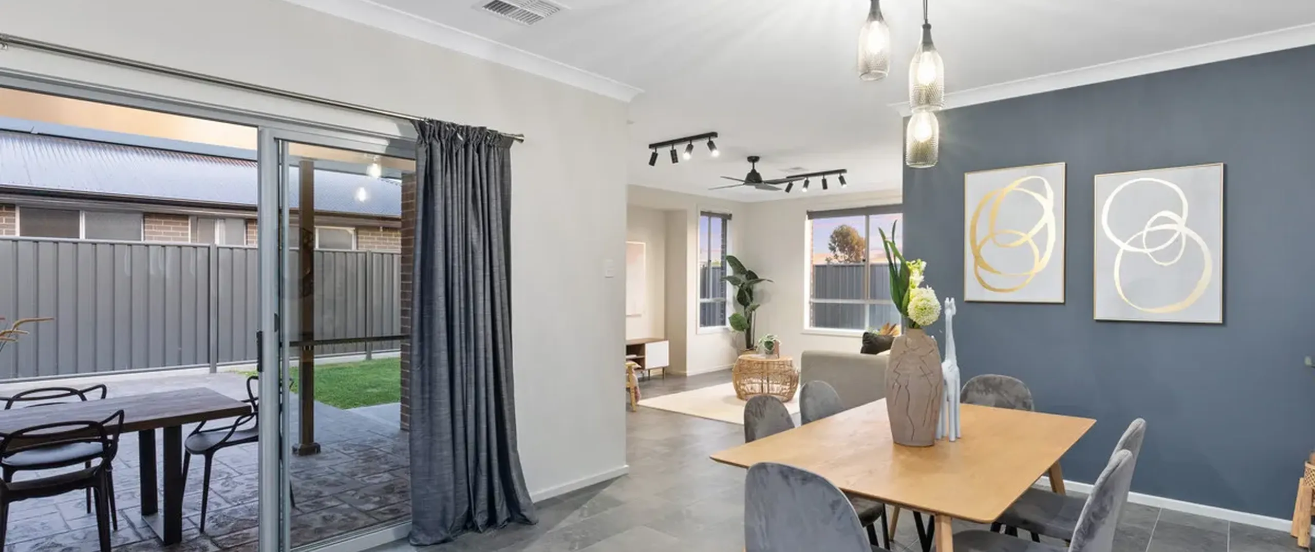 - Large open flowing kitchen, family/meals and lounge room with ceiling fan, TV niche and sliding doors opening to the alfresco