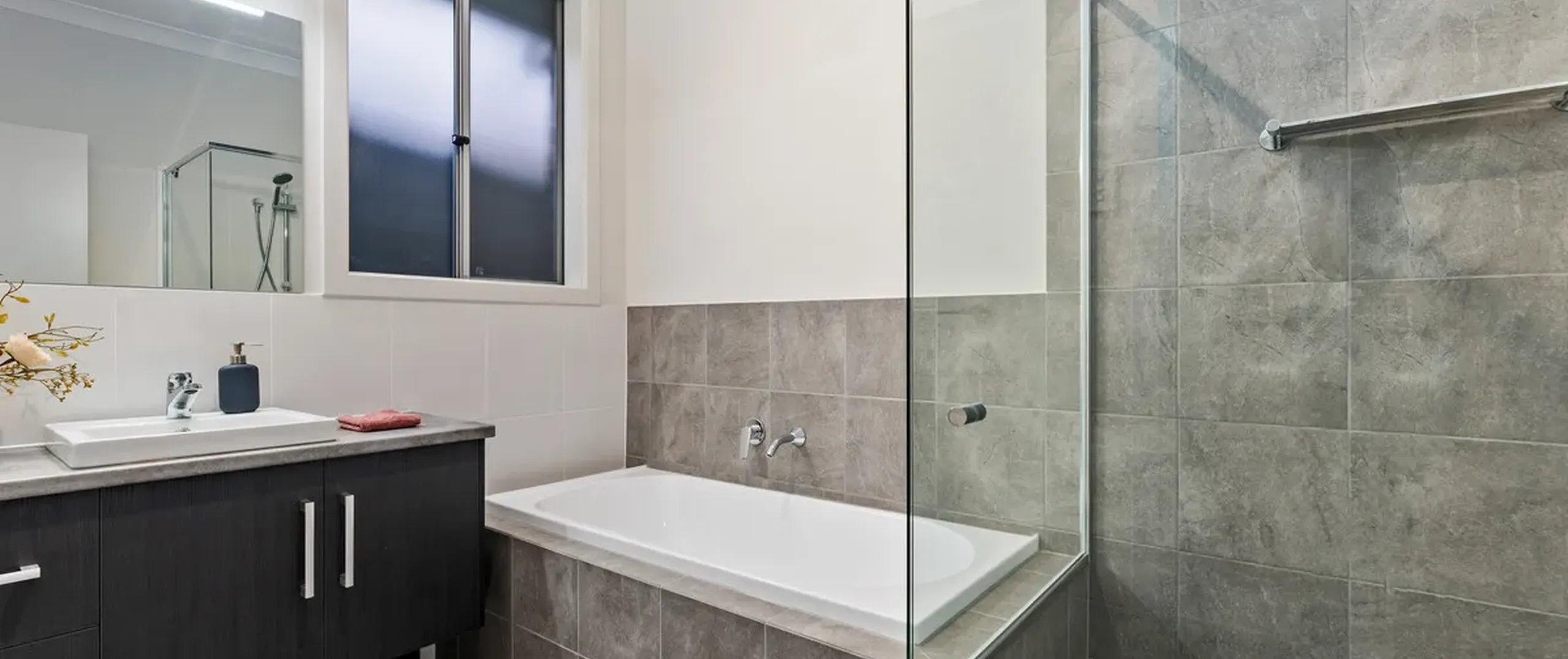 - Modern bathroom with separate bath, shower and linen storage