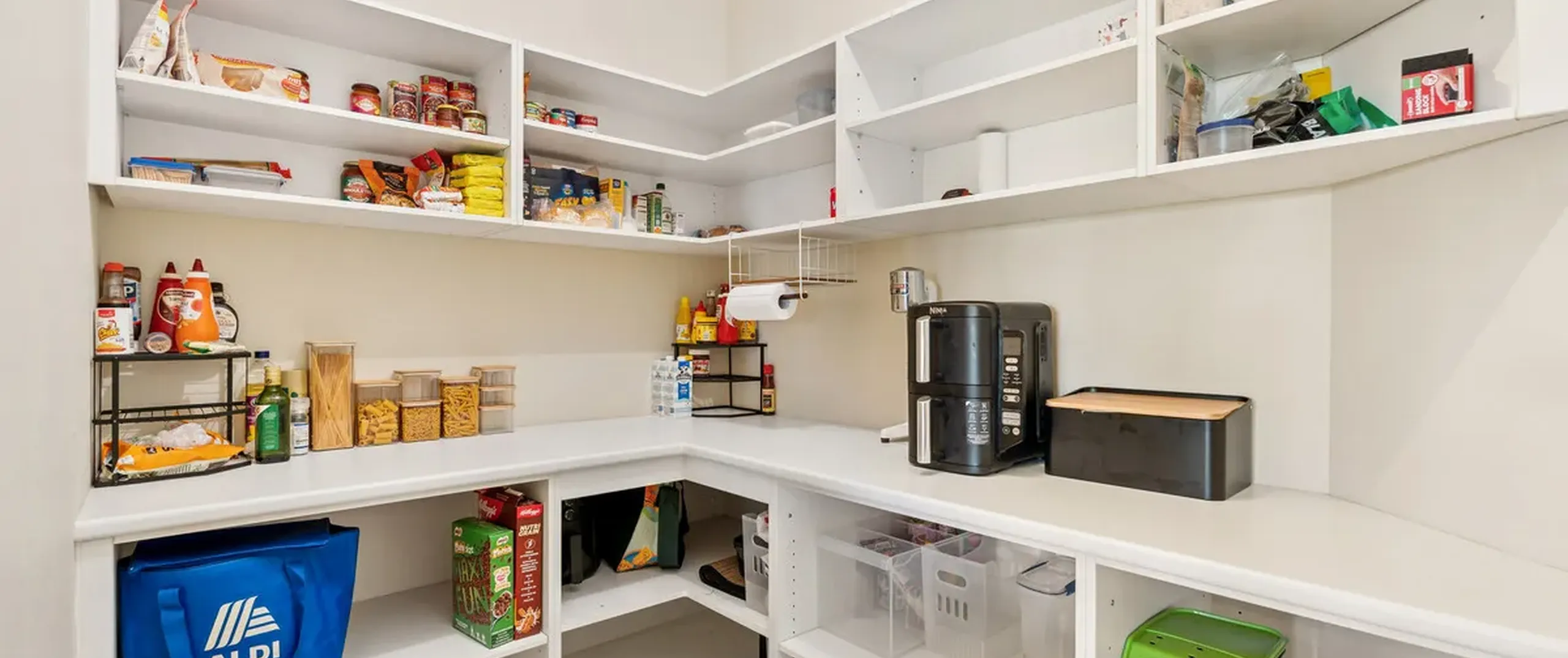 - Modern and sleek kitchen with stainless steel appliances including 900 mm freestanding cooker, double drawer dishwasher, large walk-in pantry, ample cupboard space, and Caesar Stone breakfast bar