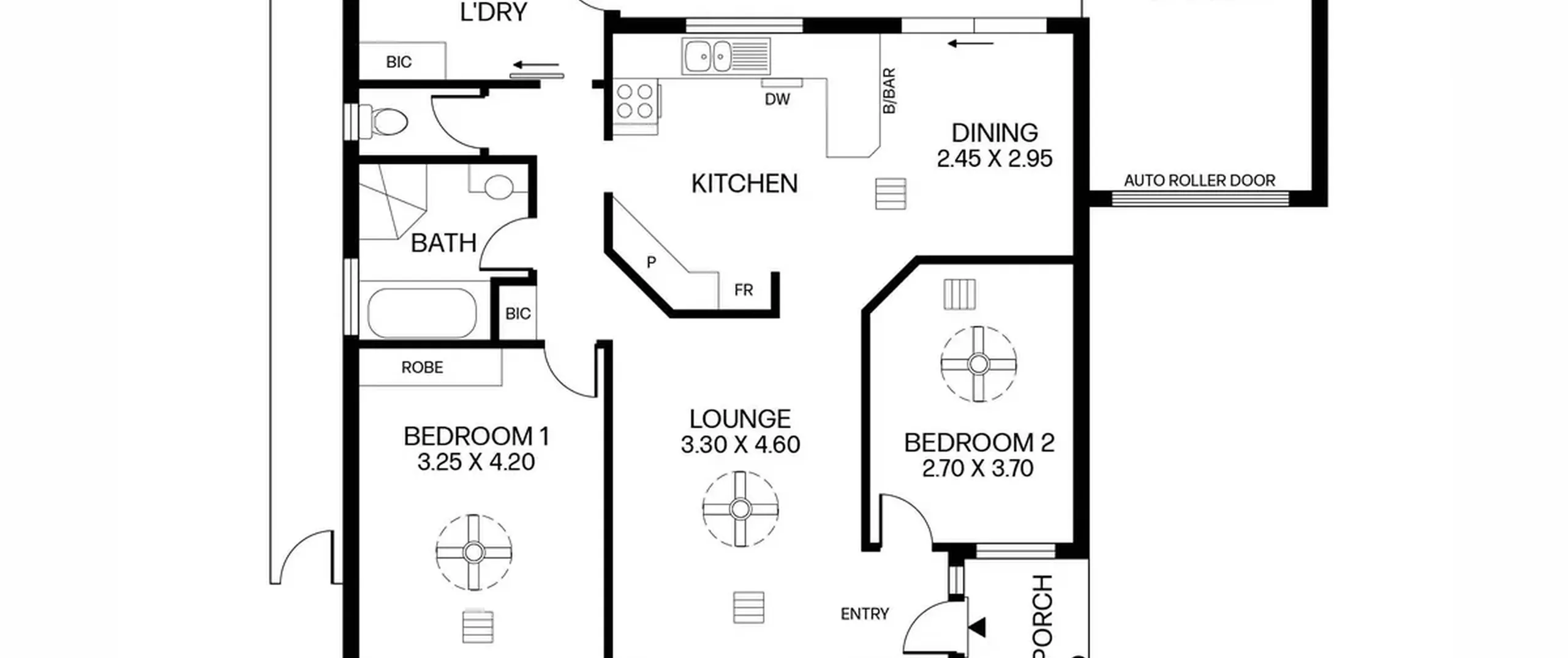 - Secure, undercover carport for one car with auto roller door and 2nd car space in front of roller door