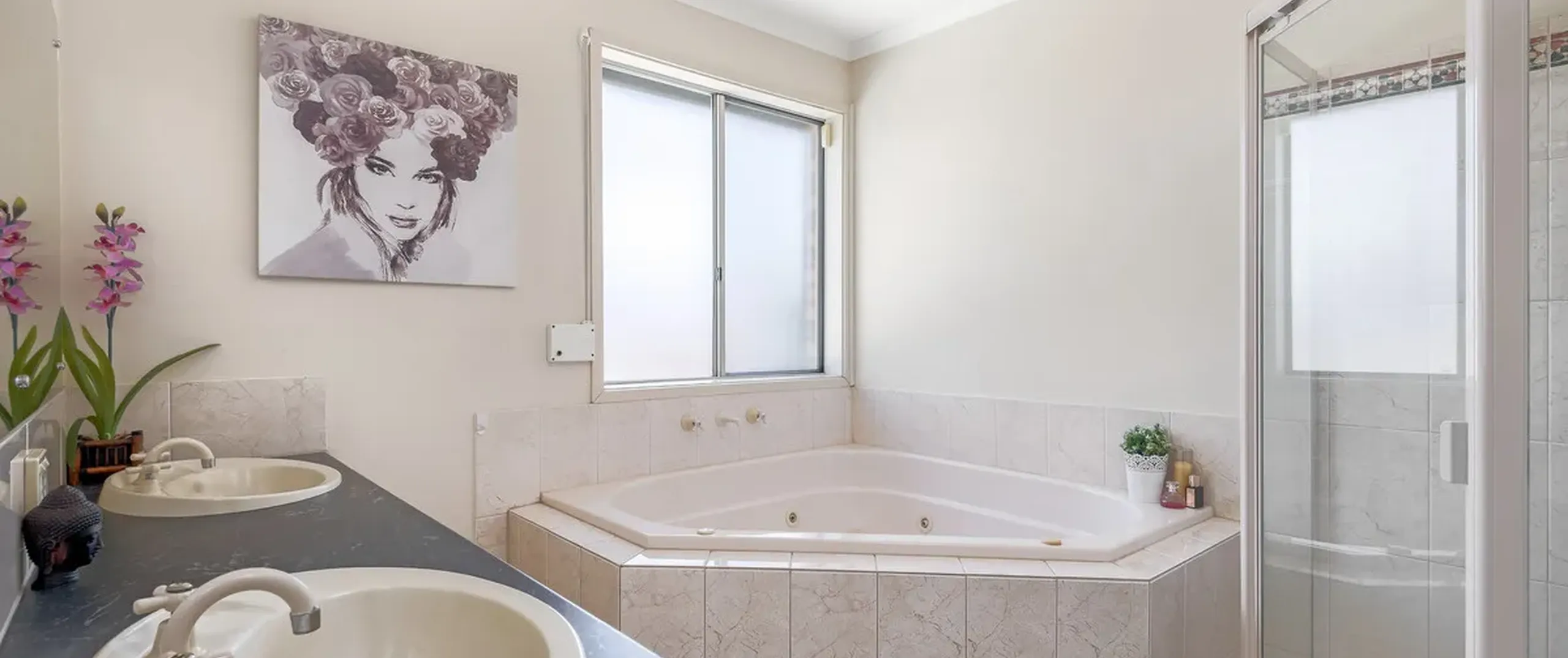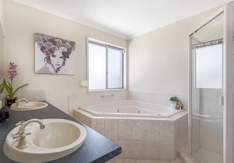 - Main bathroom with spa bath, separate shower, double sink vanity and separate toilet