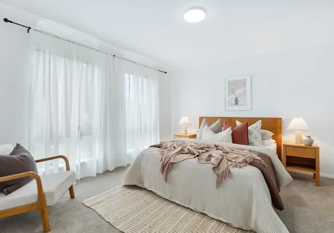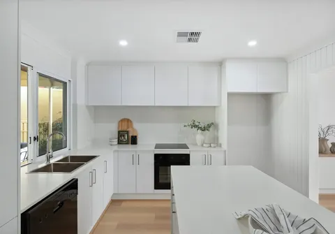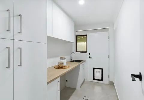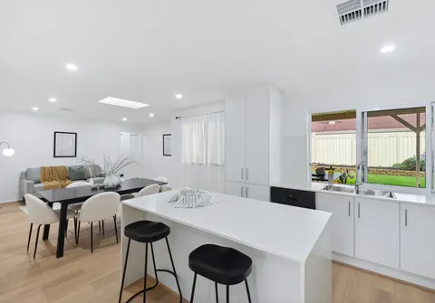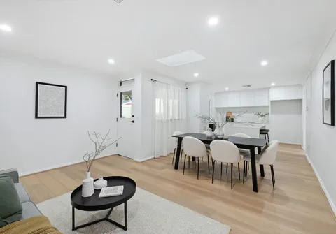 Upon entry, you'll be greeted by a sleek lounge room showcasing gorgeous joinery that flows seamlessly through to the dining and kitchen areas. This open-plan space is complemented by a skylight and LED downlights, creating a bright and inviting atmosphere, perfect for hosting family and friends.