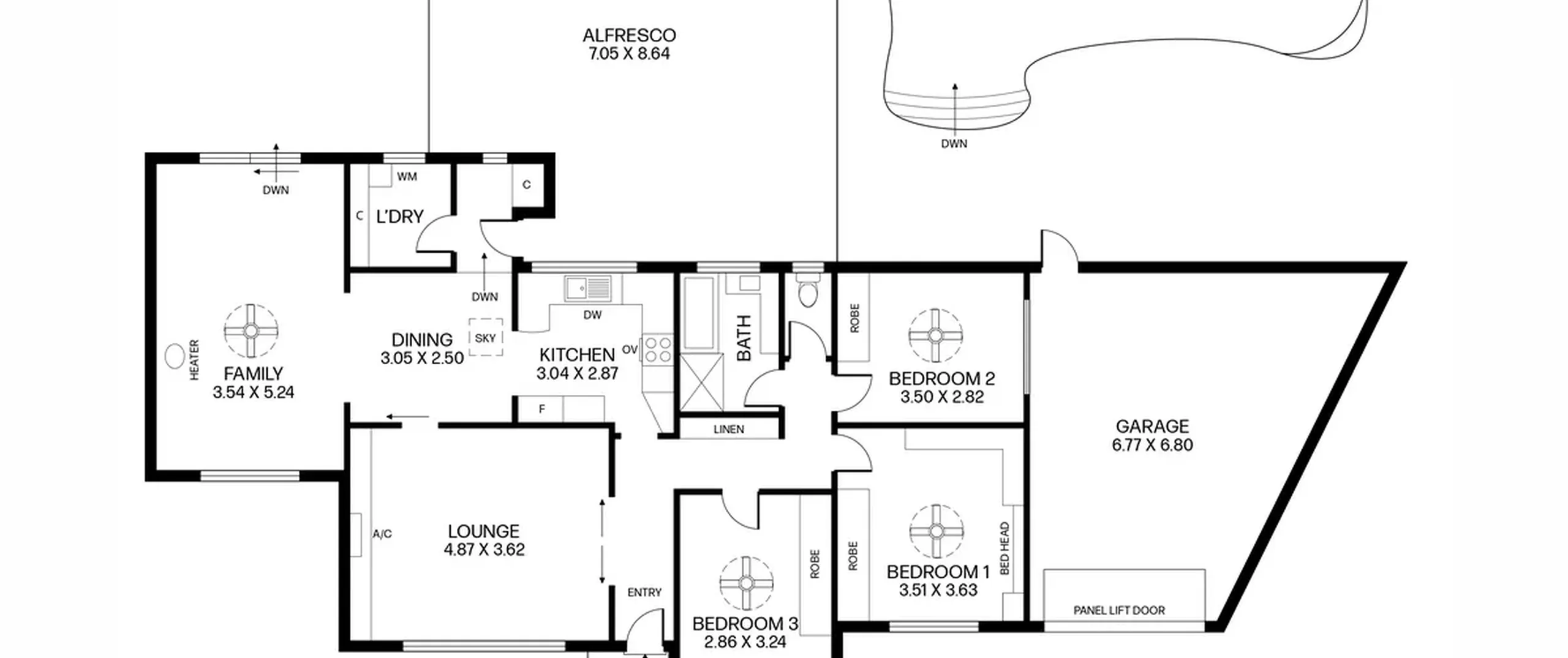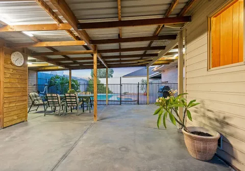 Inside offers multiple living spaces including a formal lounge plus an open plan kitchen dining/family space, three light and bright bedrooms well equipped with built in cupboards, ceiling fans and with a central easy-care bathroom and separate toilet. The kitchen overlooks the sparkly inground pool and is complete with ample cupboard and bench space.