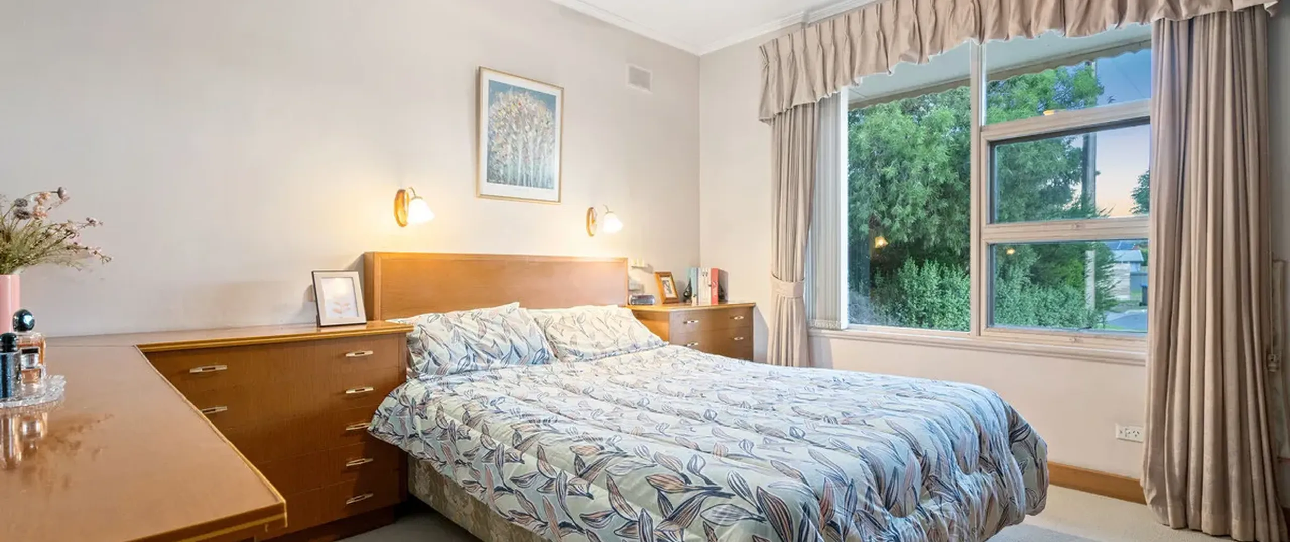- Large bedroom one with built-in cupboards and bed head, built-in robe and ceiling fan