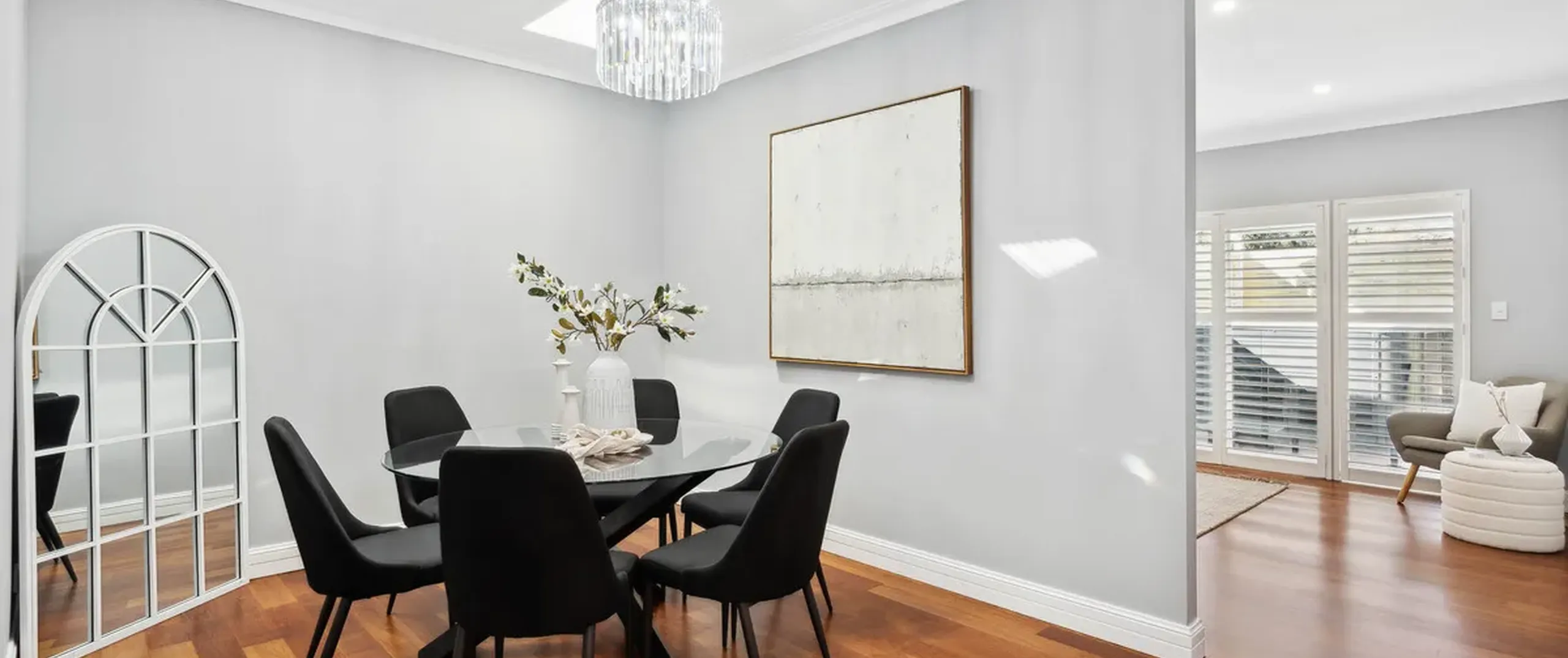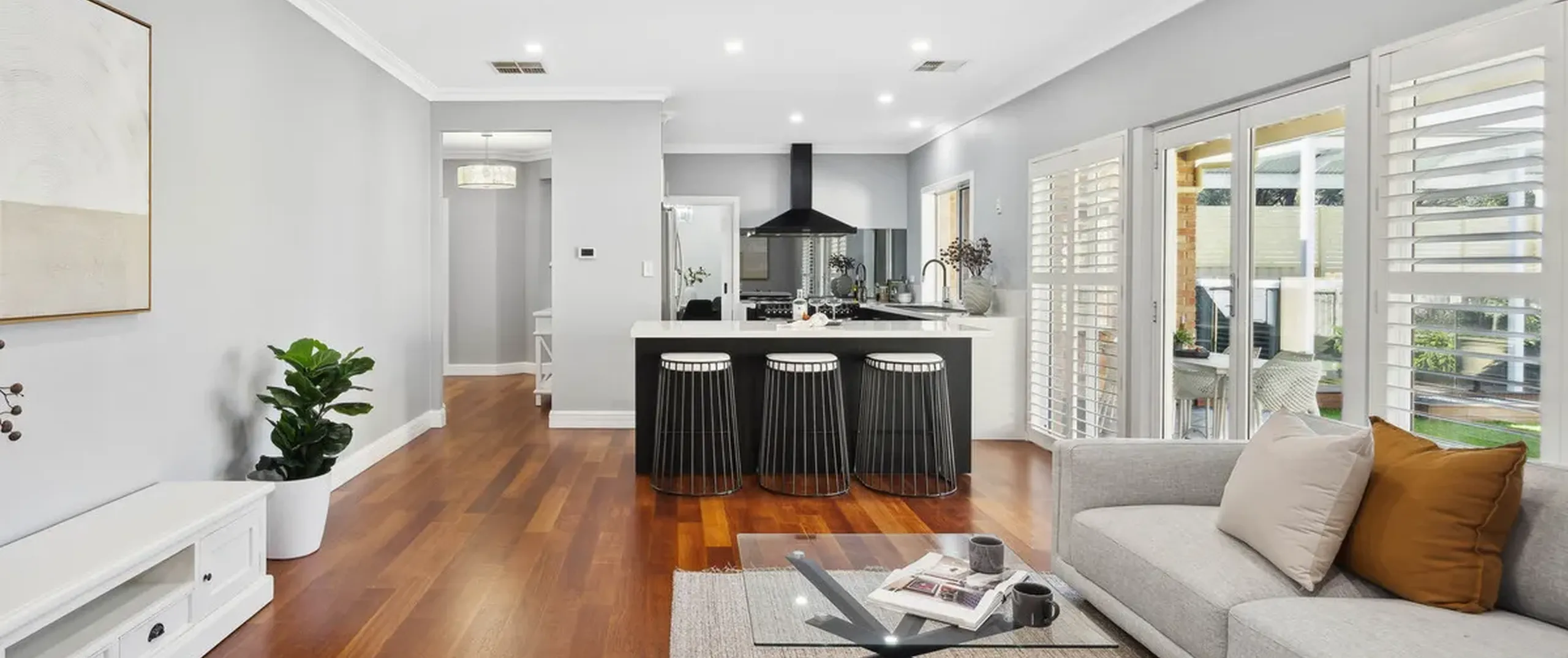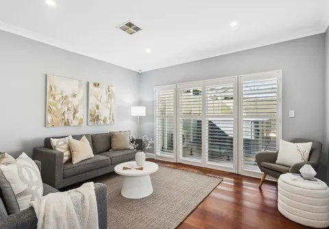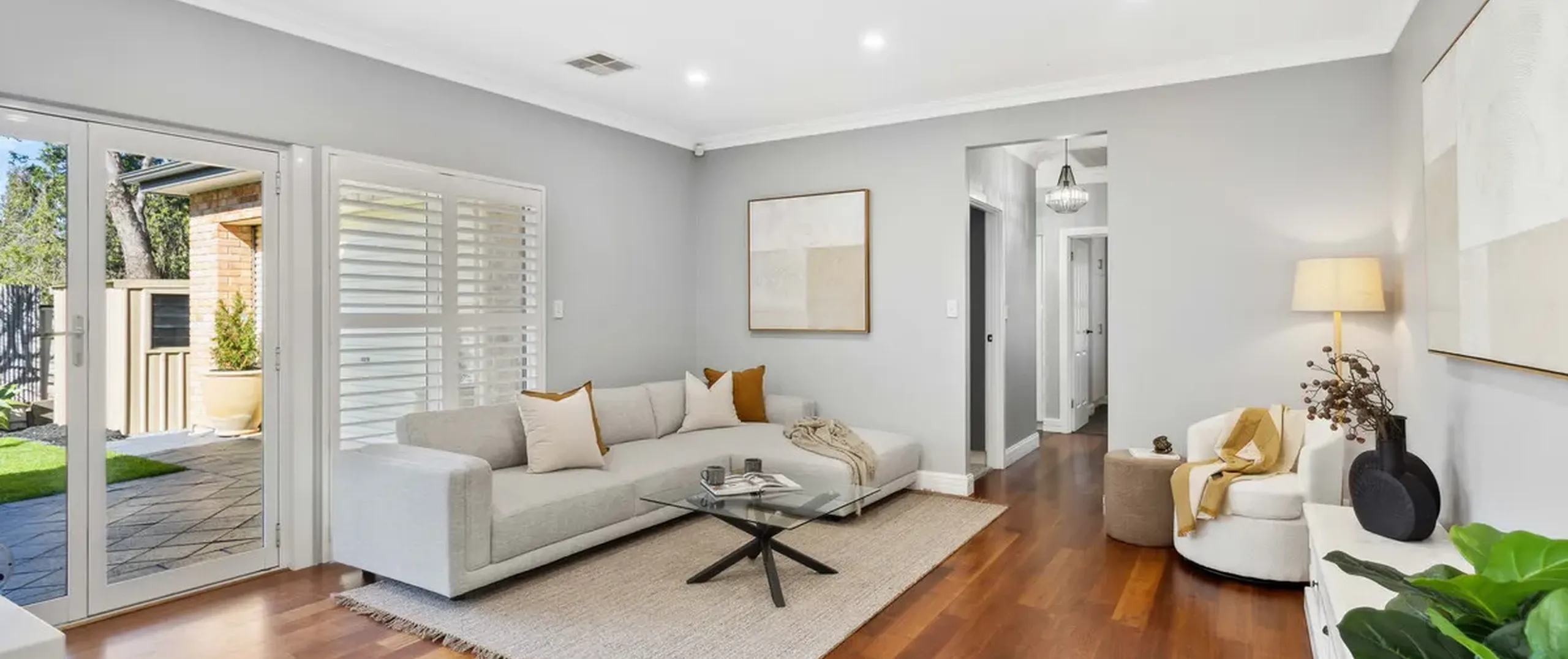 - Light filled living room with French doors