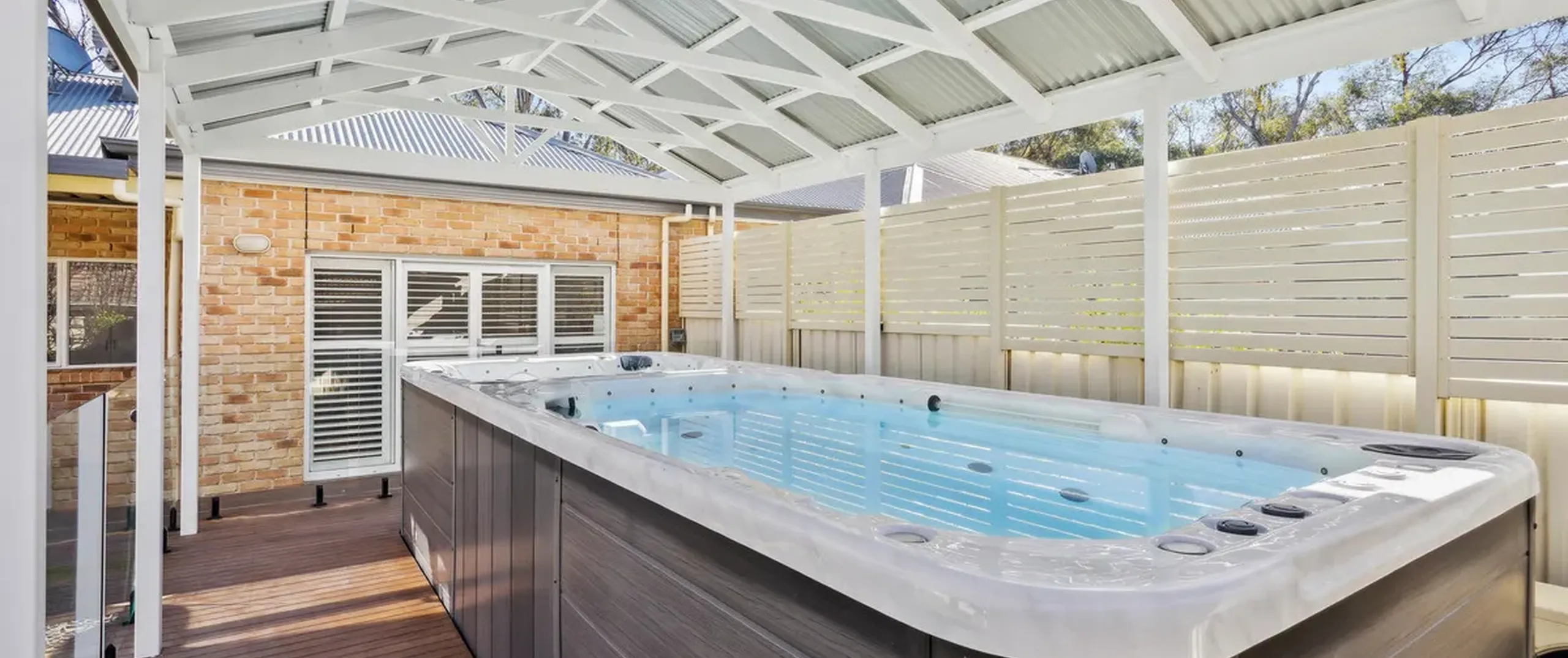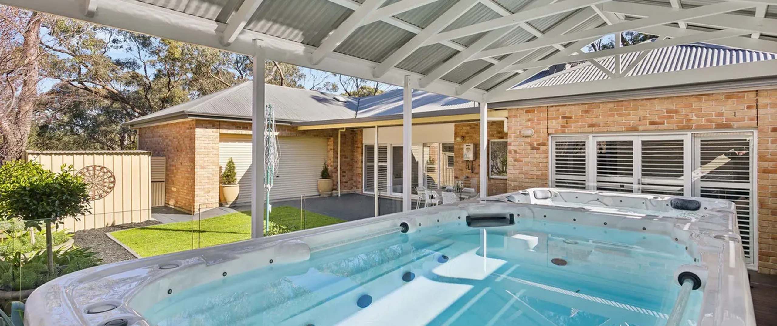 No matter the season, the undercover swim spa with heating/cooling pumps will be a delight. With a separate pool space at one end (with button controlled jets to swim against if desired) and separate spa at the other end, the backyard becomes your own private resort.