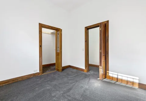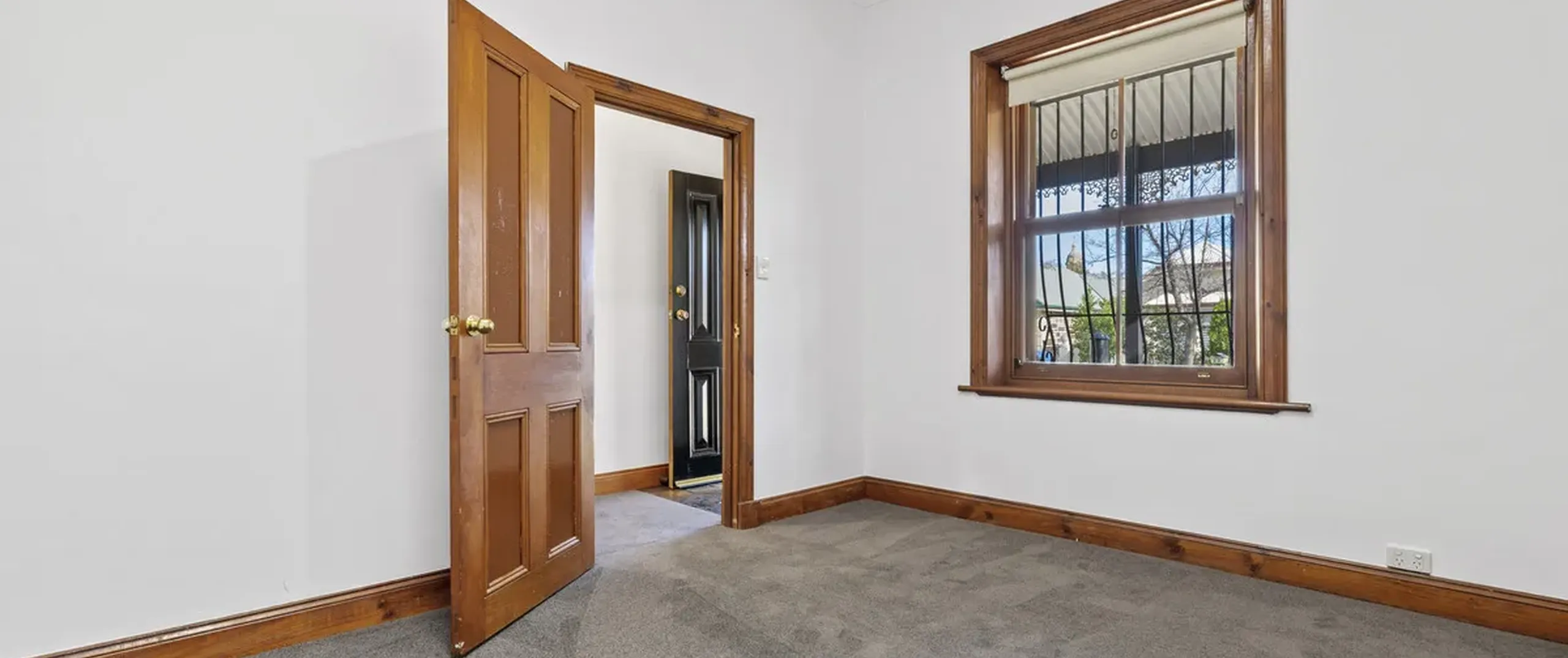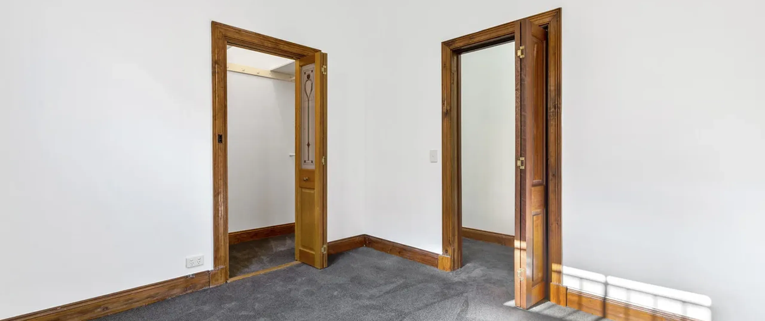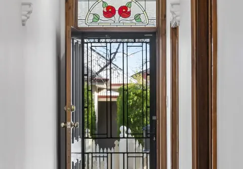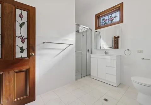 Both bedrooms run off the main hallway, including one with a skylight. The master bedroom boasts a ceiling fan and walk-in robe. The bathroom has been beautifully updated, plus decorative timber trim features throughout, stunning stained glass windows and ornate details.