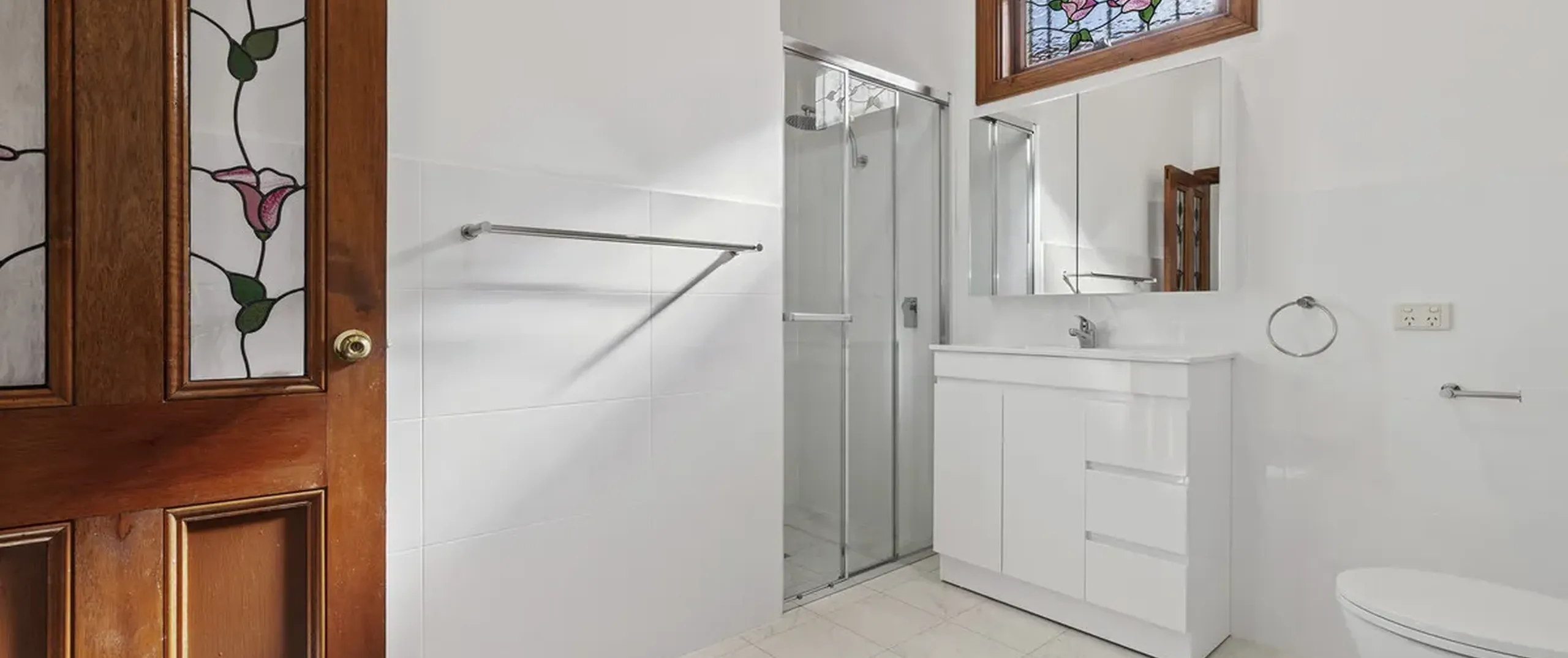 - Recently renovated bathroom featuring modern tiling, standalone vanity, updated shower screen, beautiful stained window glass and laundry facilities