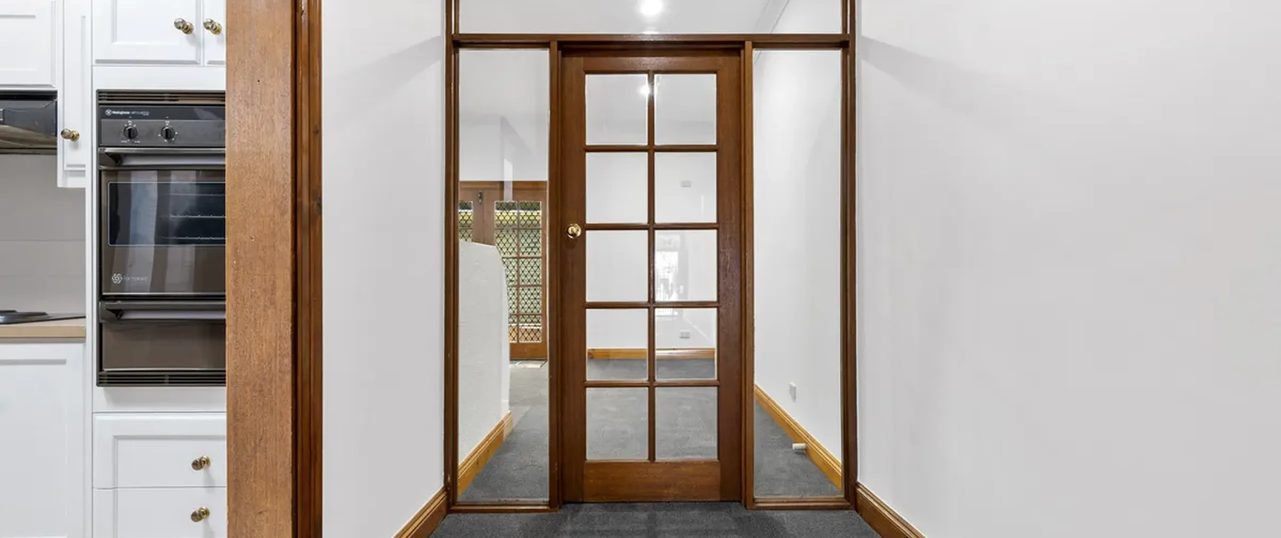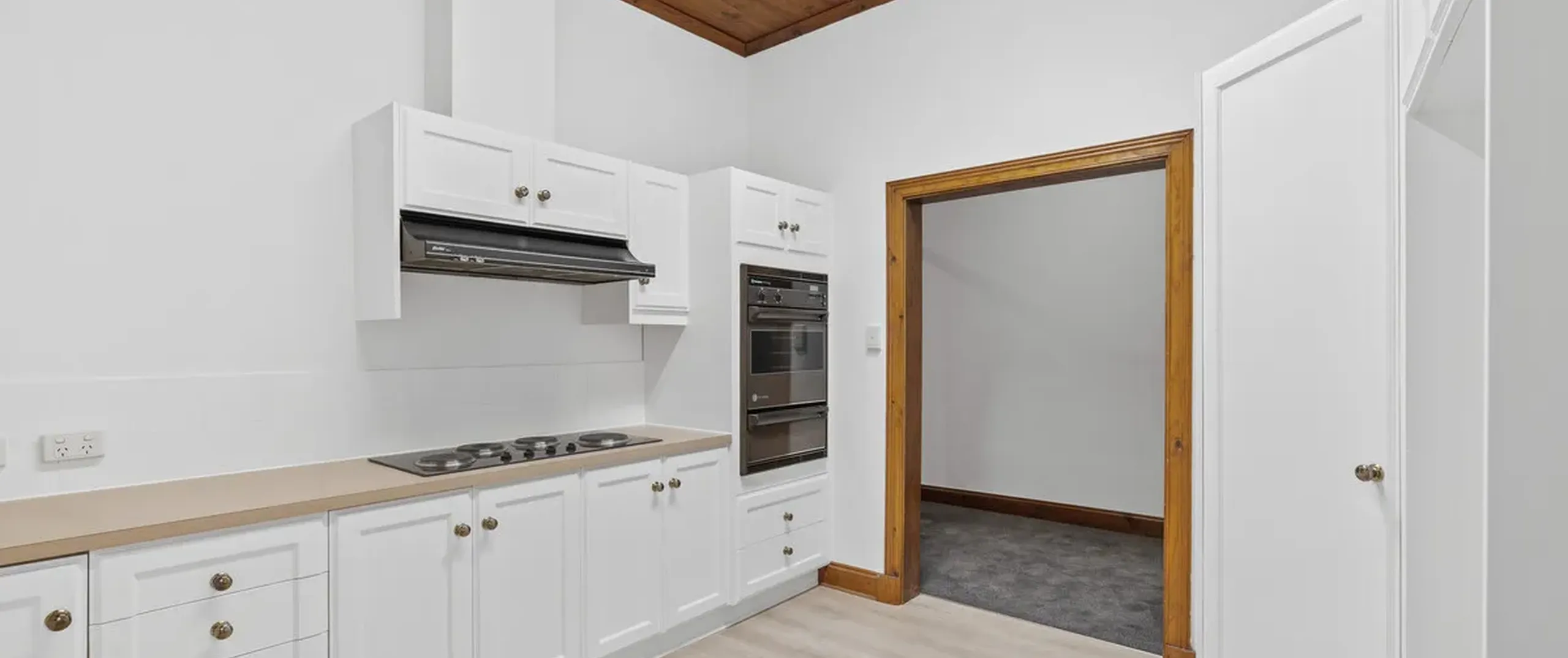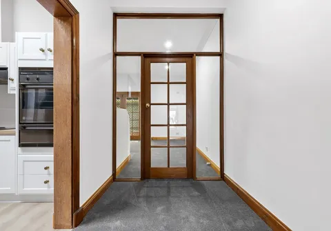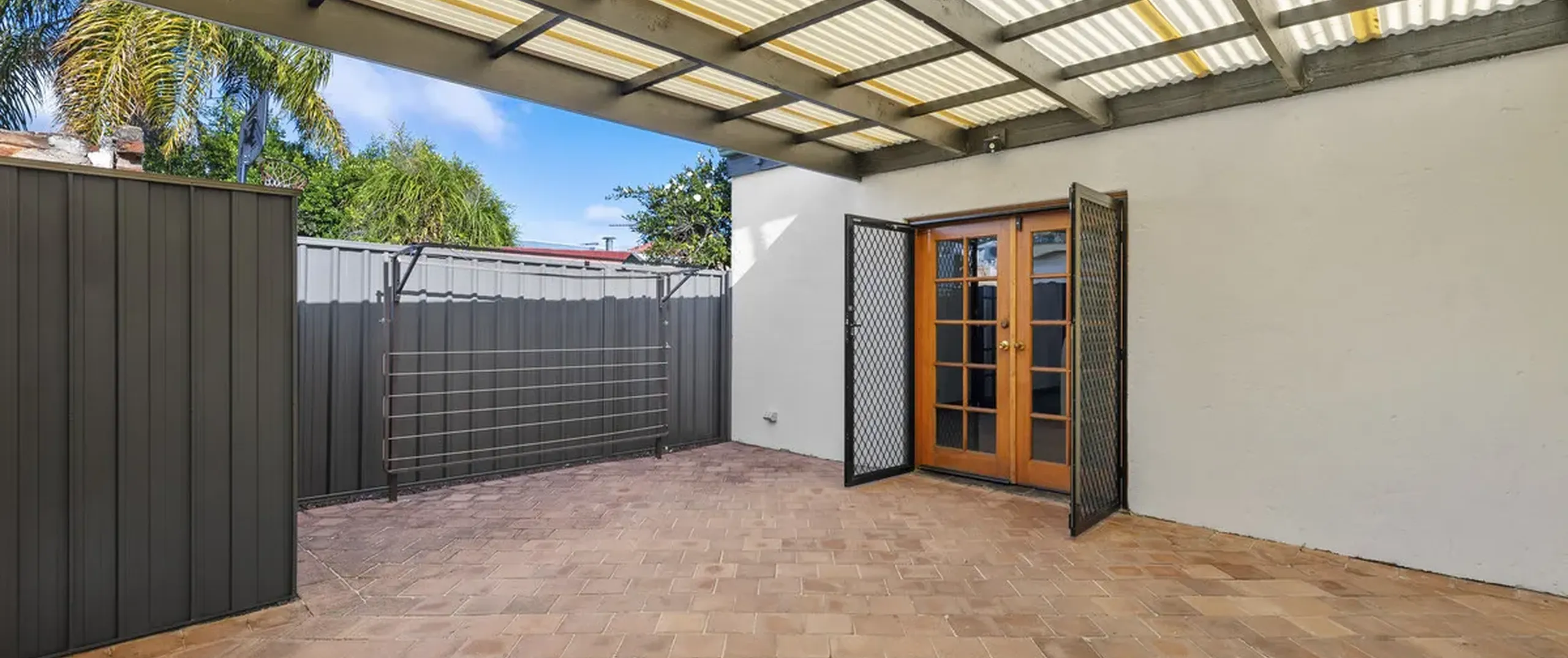 Soft natural light floods in and illuminates the generously proportioned kitchen and dining room, with French double doors that lead to the covered verandah/carport with valuable rear lane access. The kitchen is nestled under a tall timber-lined ceiling and features ample bench space, plenty of storage, a walk-in pantry and external access to a quaint side yard.