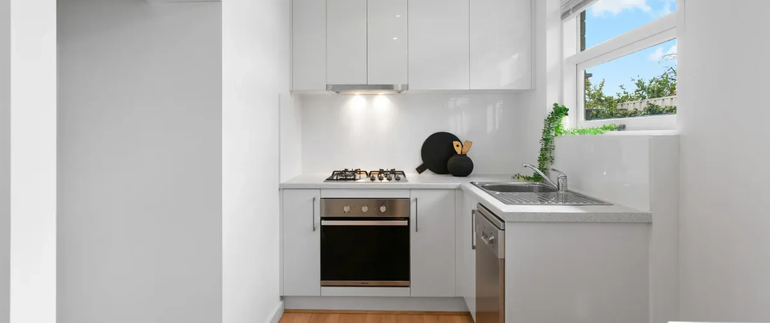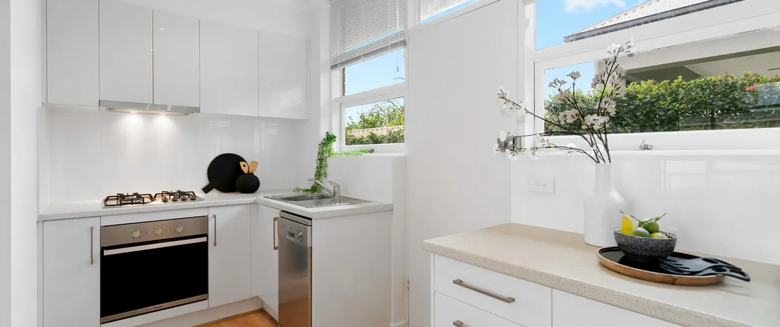 - Stylish kitchen with stainless steel appliances, gas cook top and dishwasher