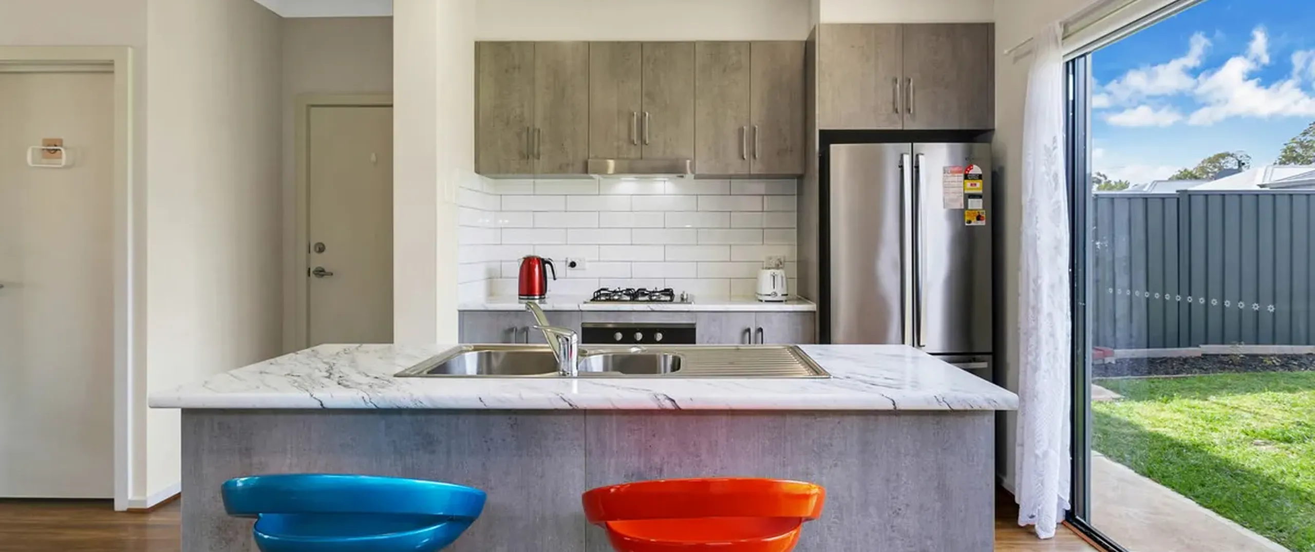 - Contemporary kitchen with stainless steel appliances and ample cupboard space
