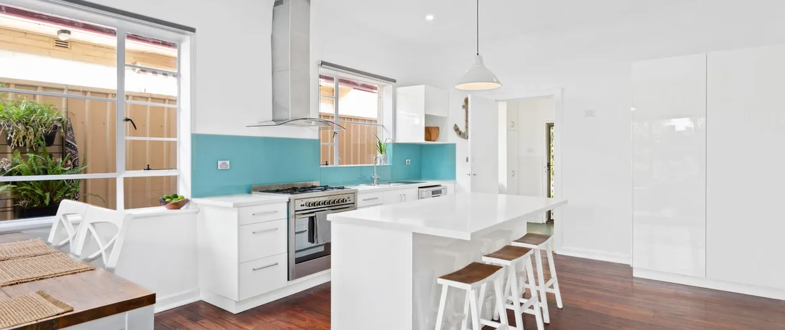 - Bright modern kitchen featuring a stainless-steel dishwasher, 900mm Glem oven and gas cooktop, pantry and a large island bench with breakfast bar
