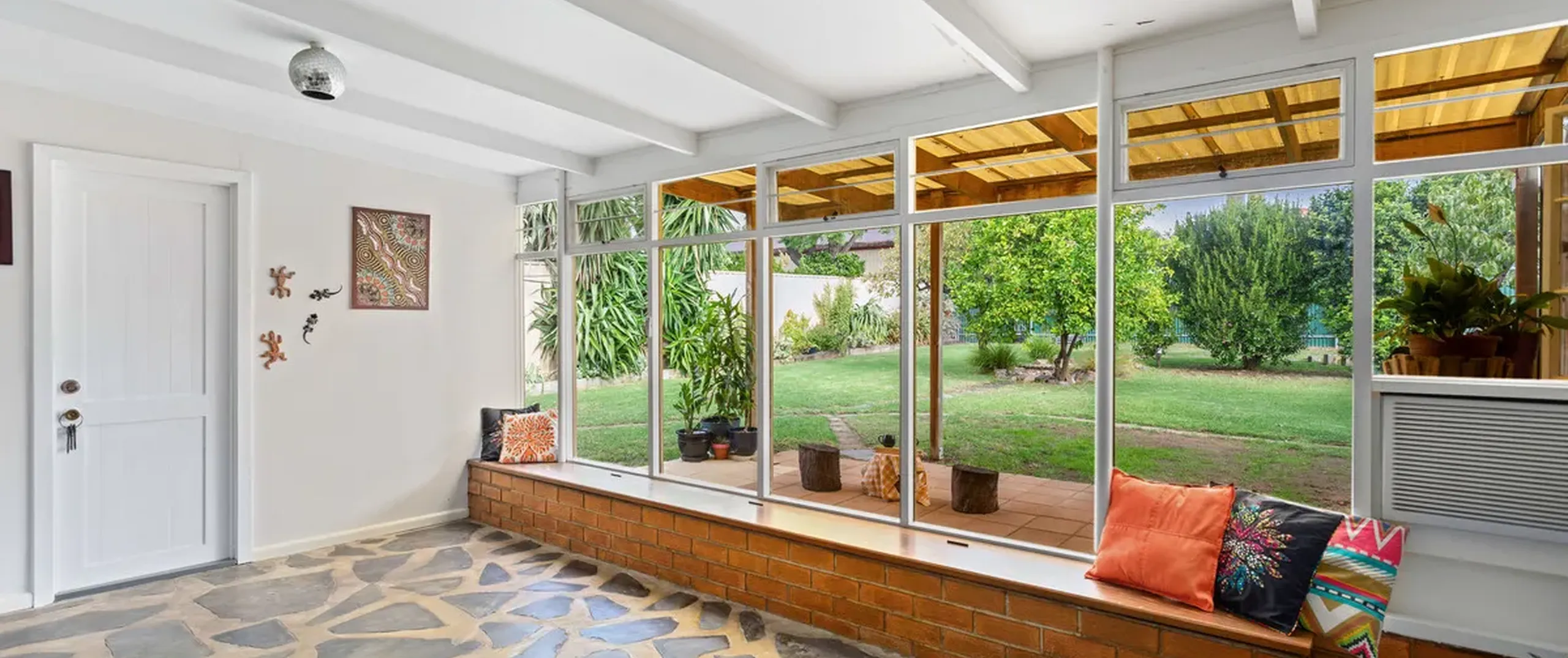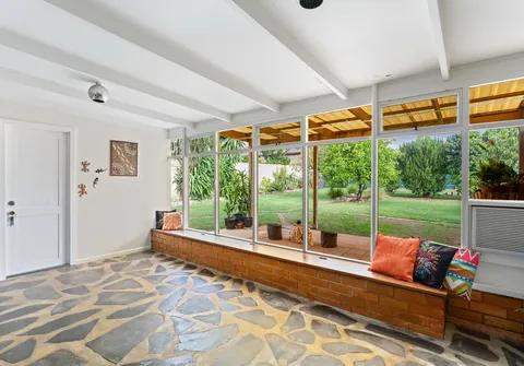 - Warm and inviting sunroom with built-in bench/cupboard and air conditioning unit