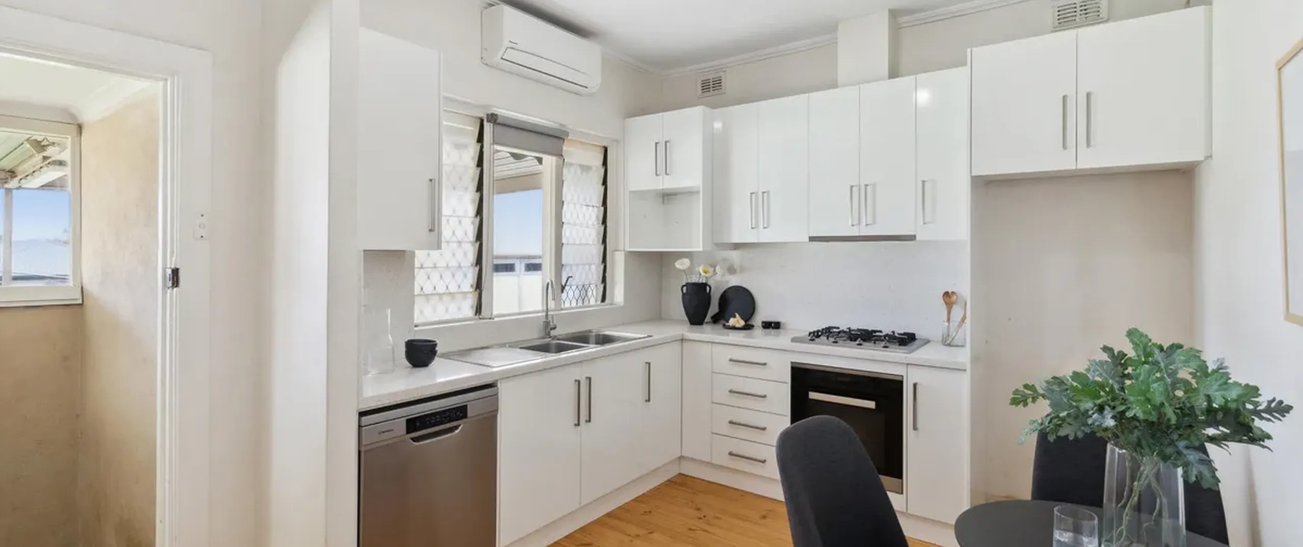 - Modern dine-in kitchen featuring Miele stainless steel oven, gas cooktop, Westinghouse dishwasher and split system air conditioner