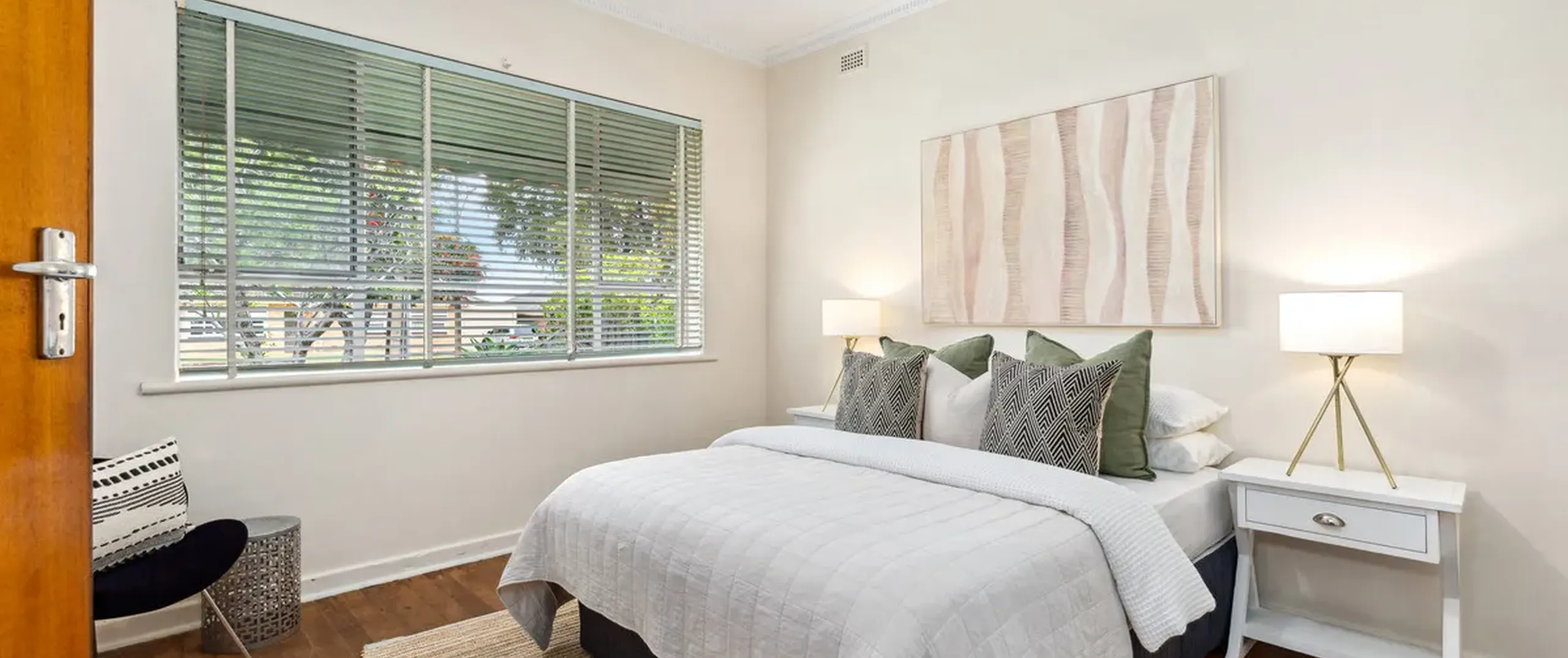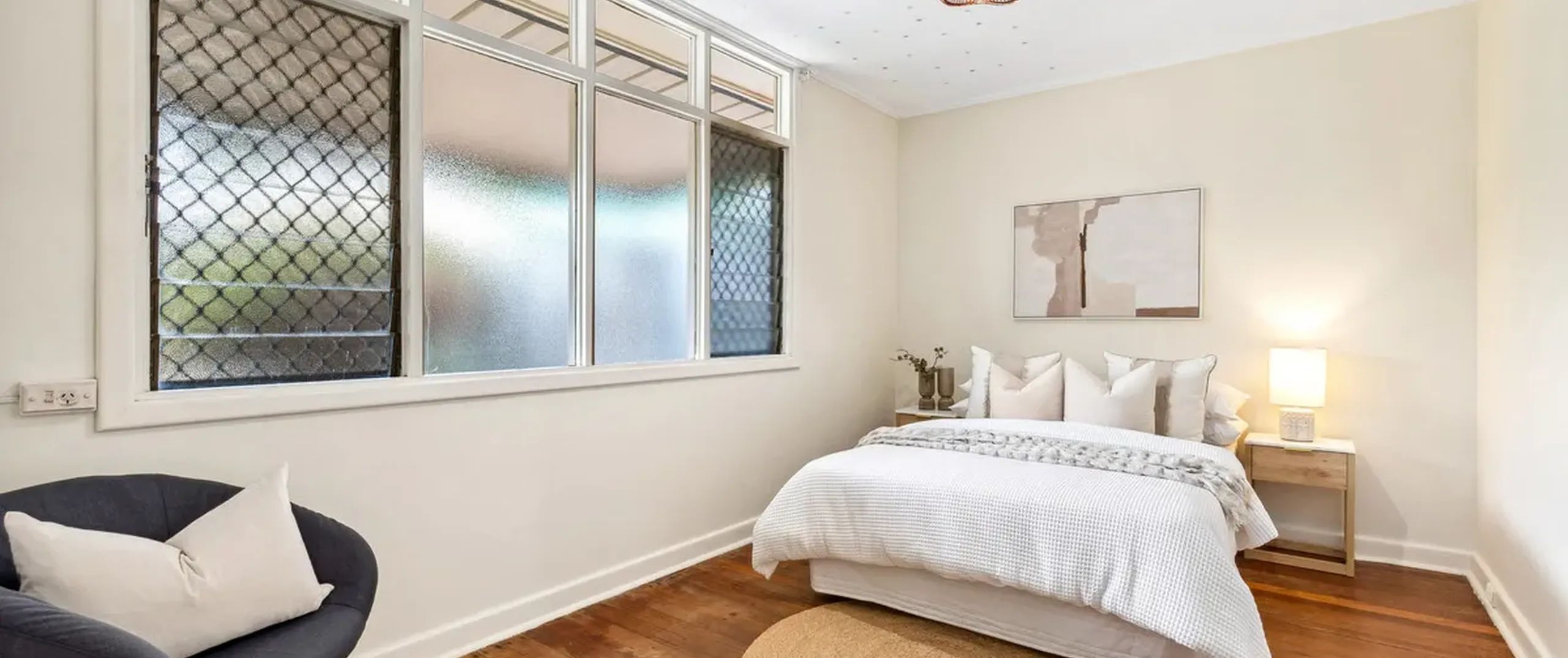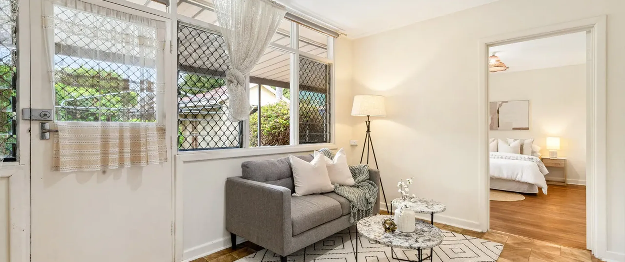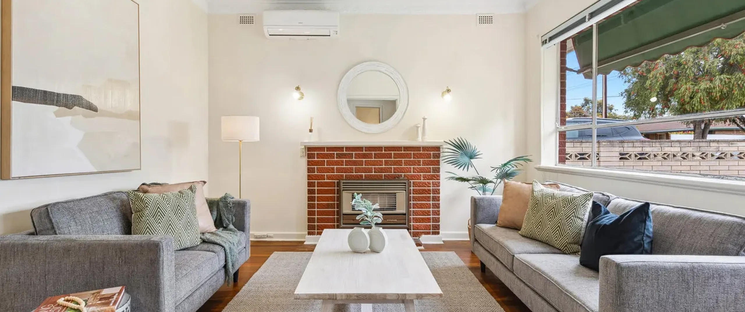 - Light-filled lounge room equipped with split system air conditioner, oil heater and ceiling fan
