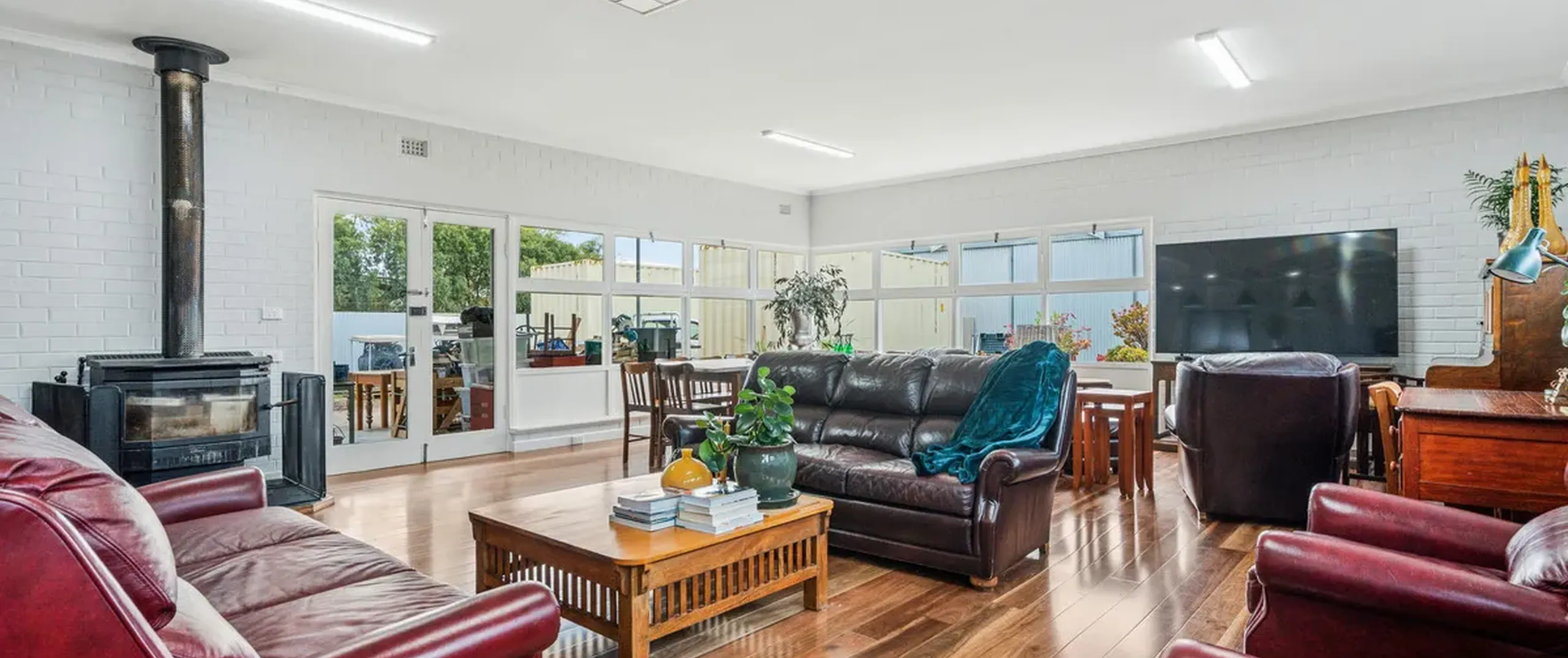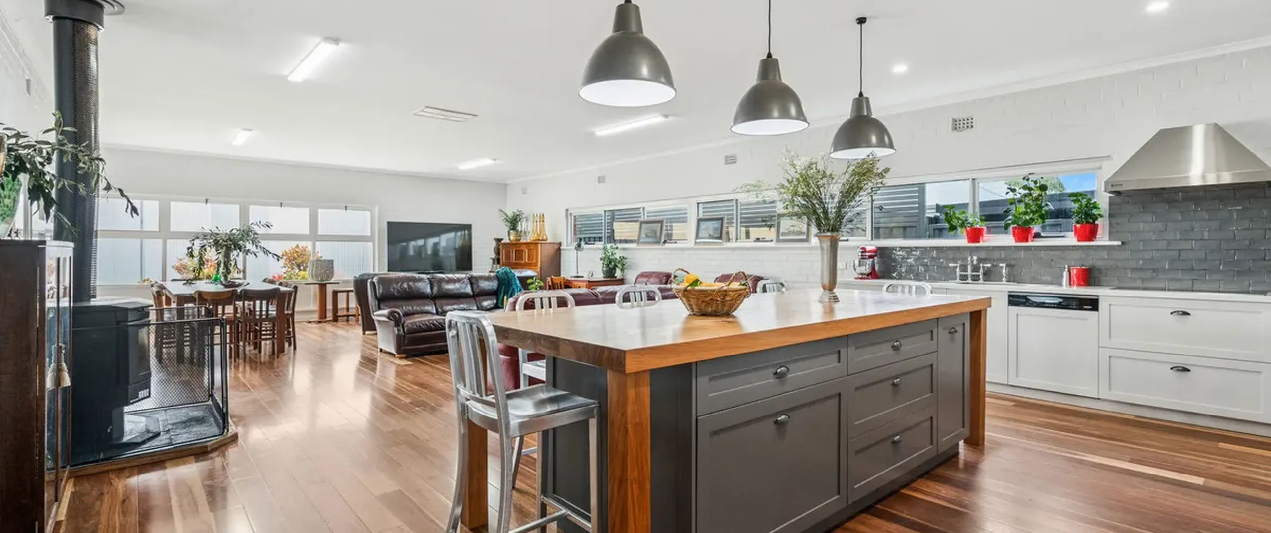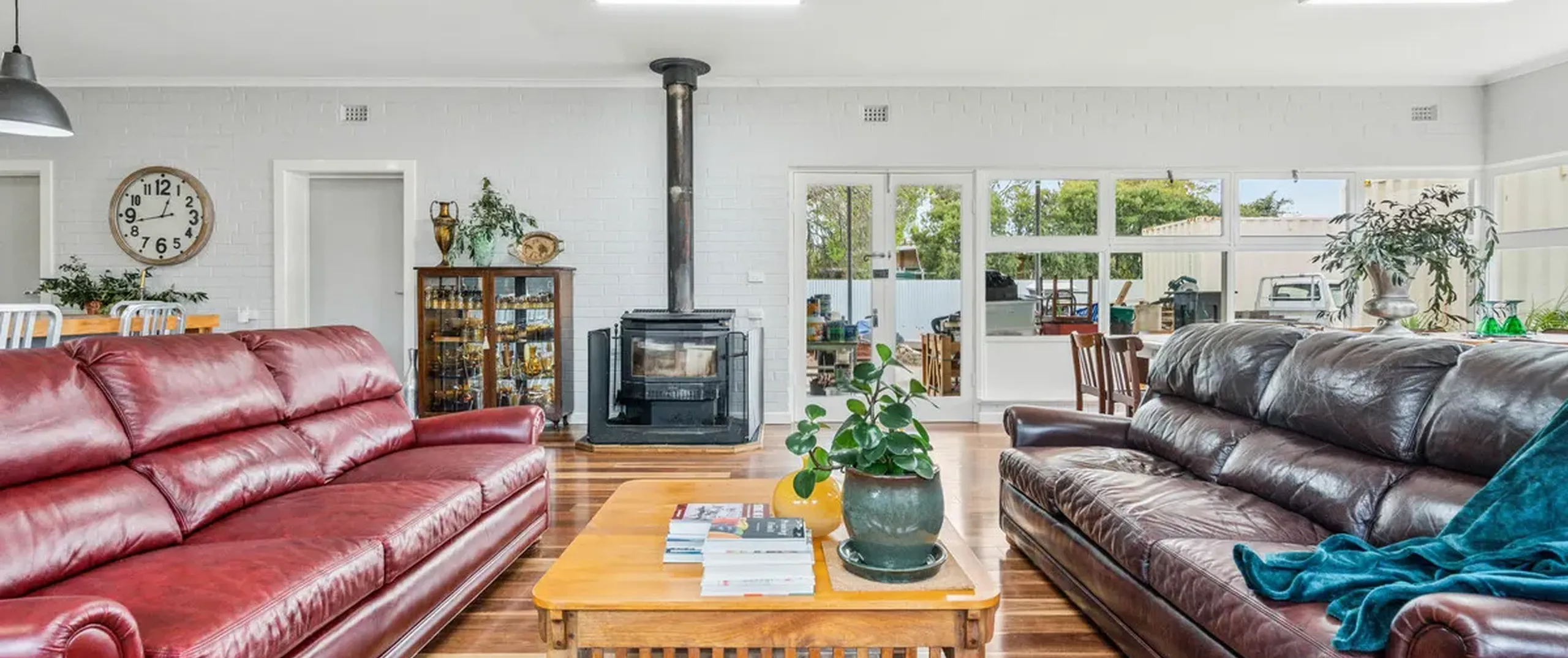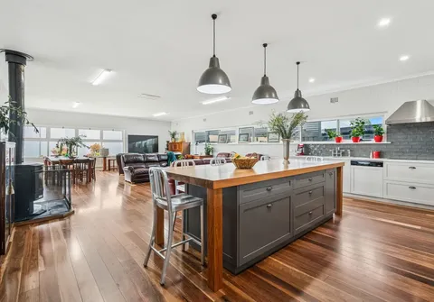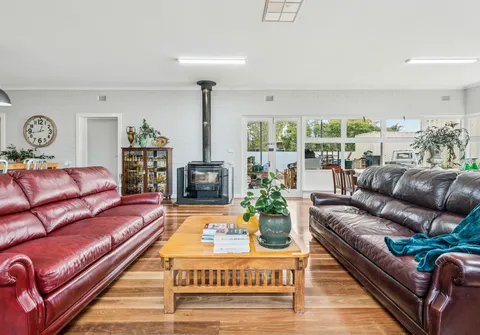- Light filled, open plan kitchen, dining and living area with combustion heater