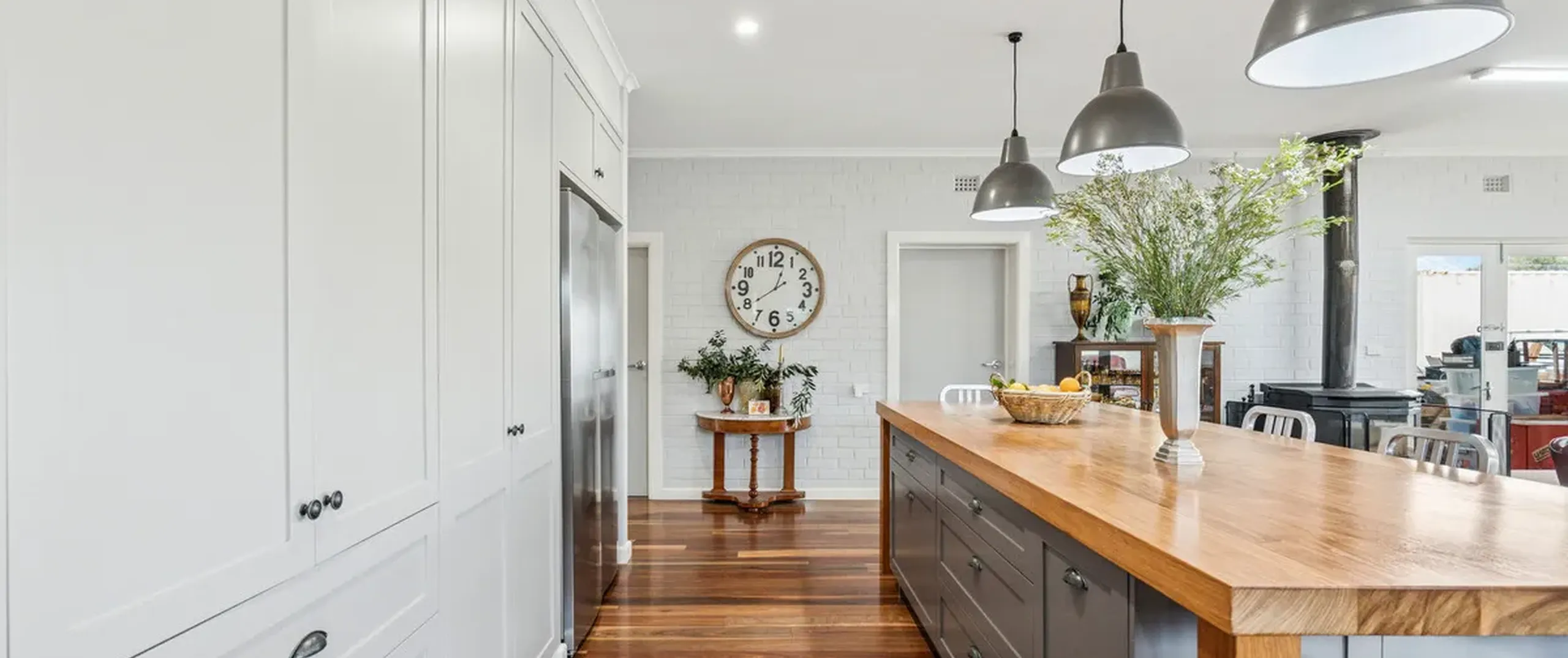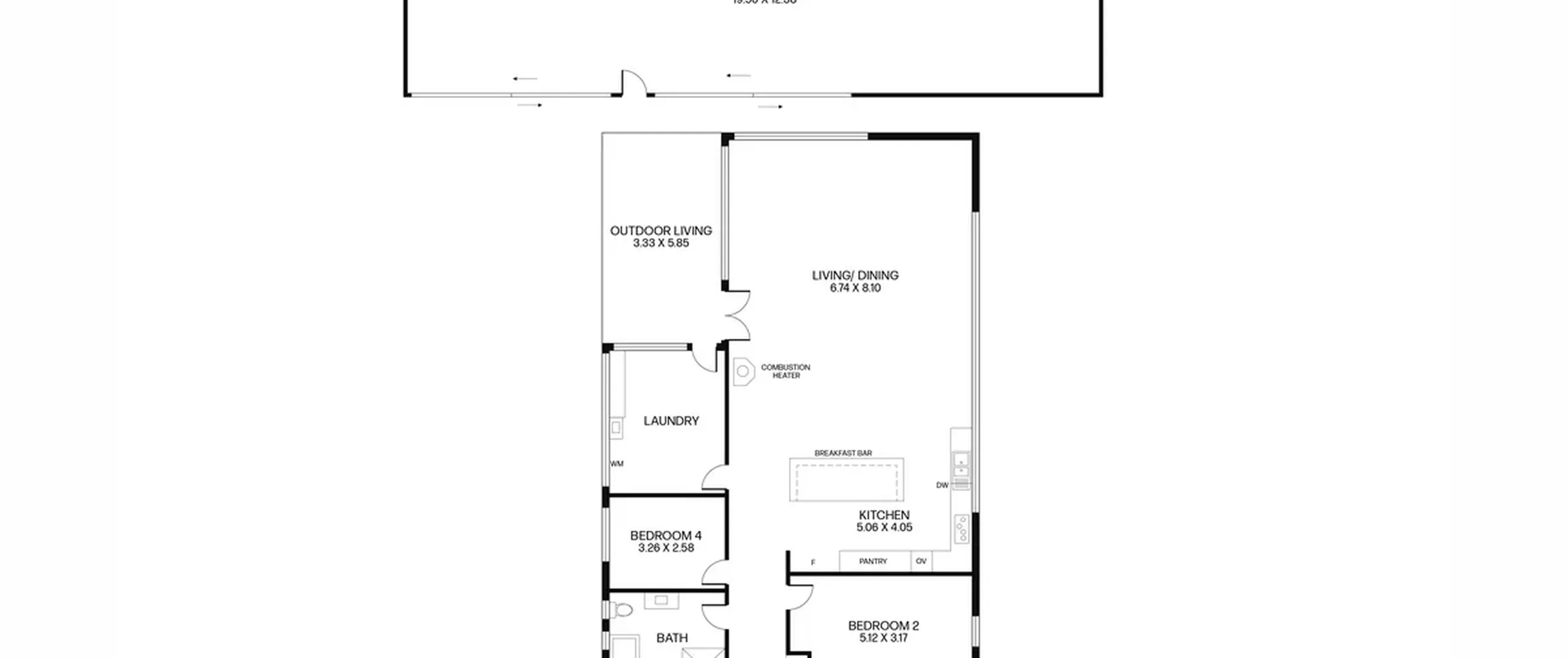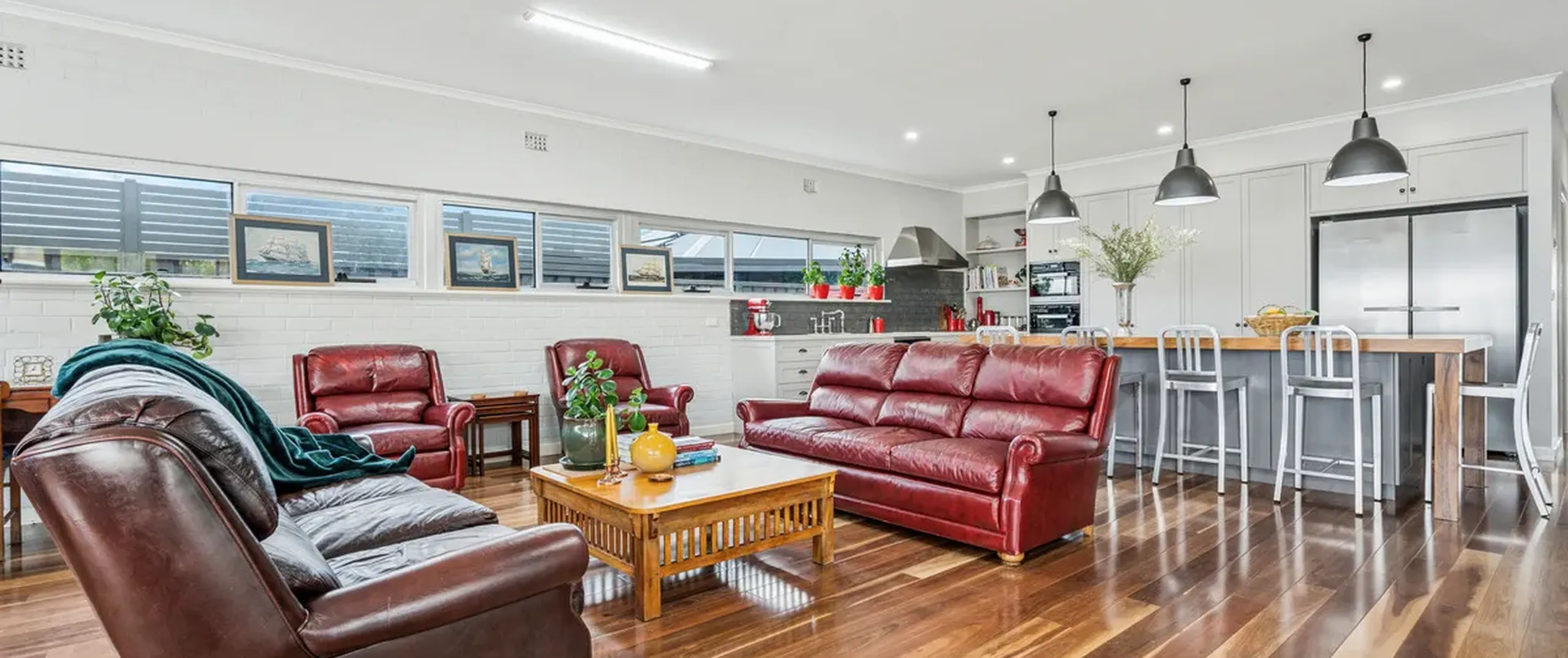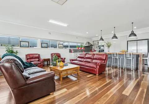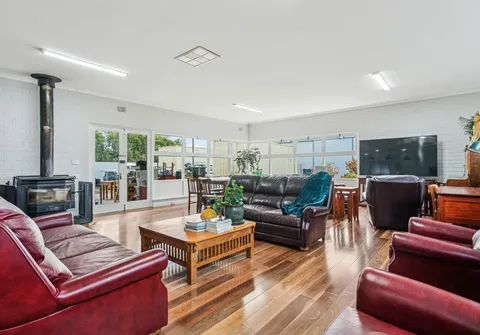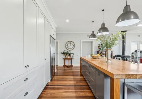 - Light filled, open plan kitchen, dining and living area with combustion heater