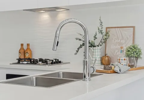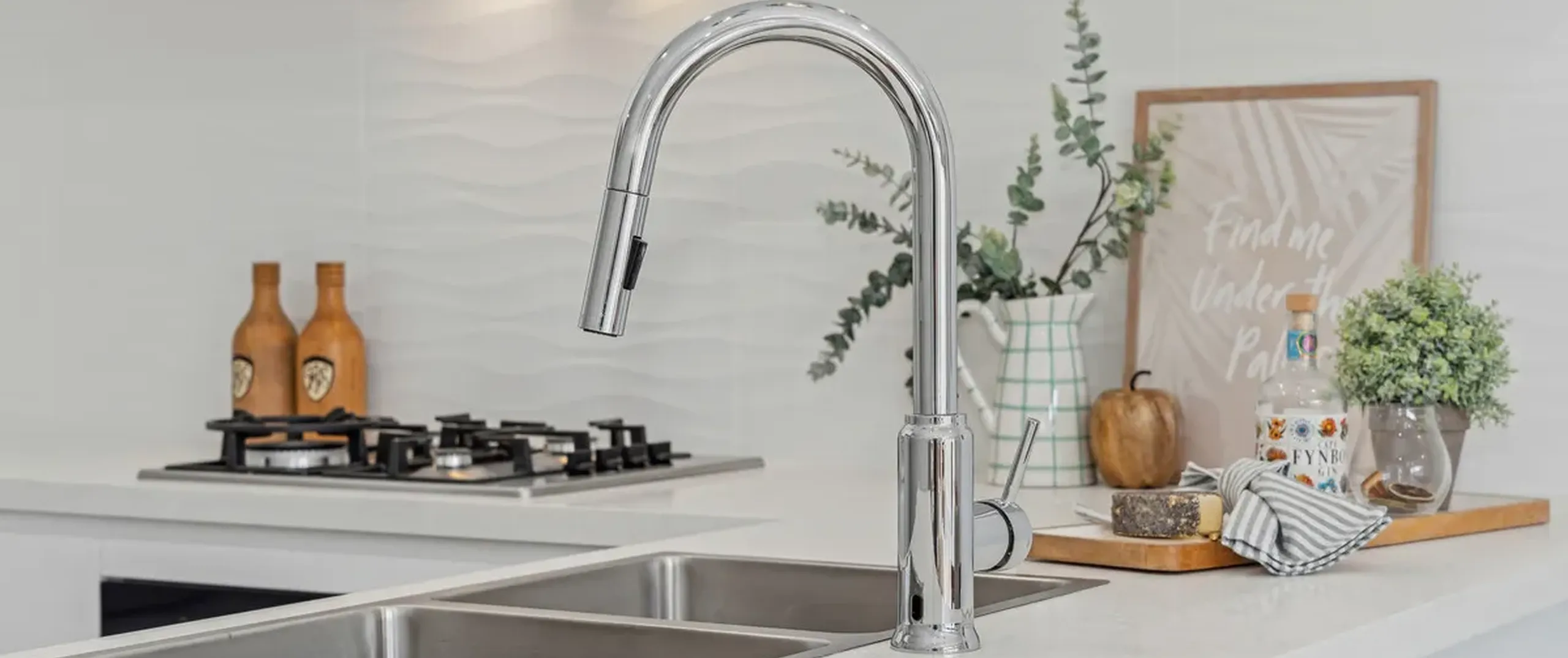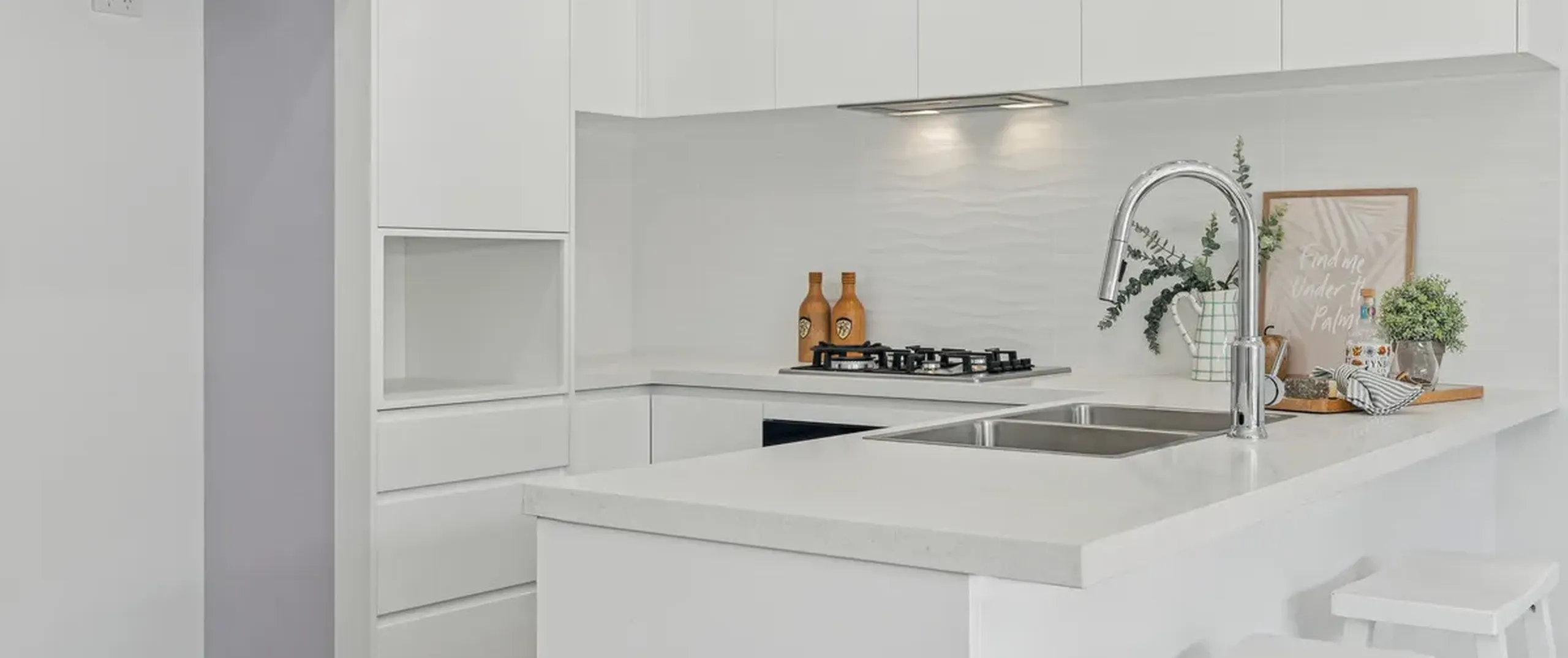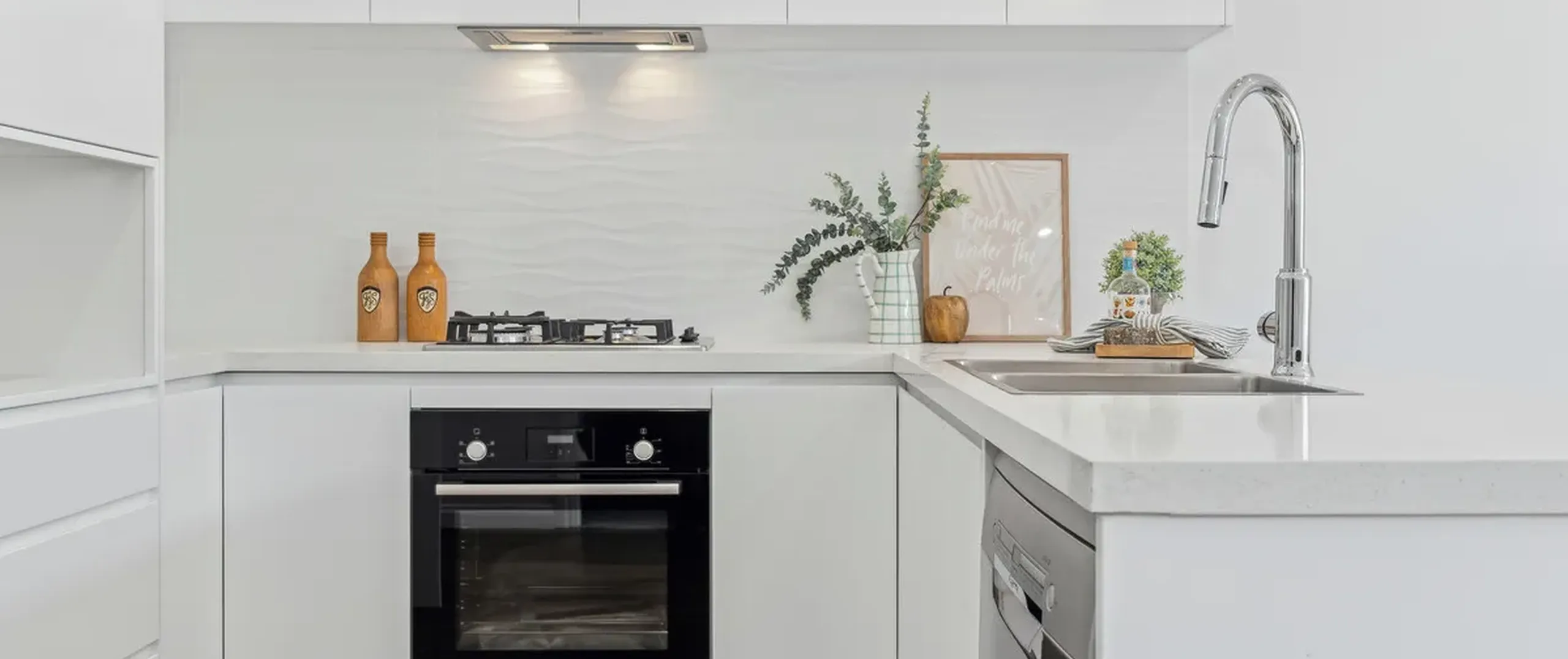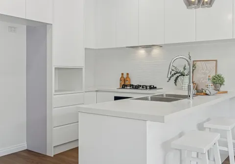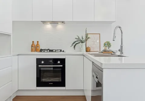 - Sleek white kitchen with gas cooking