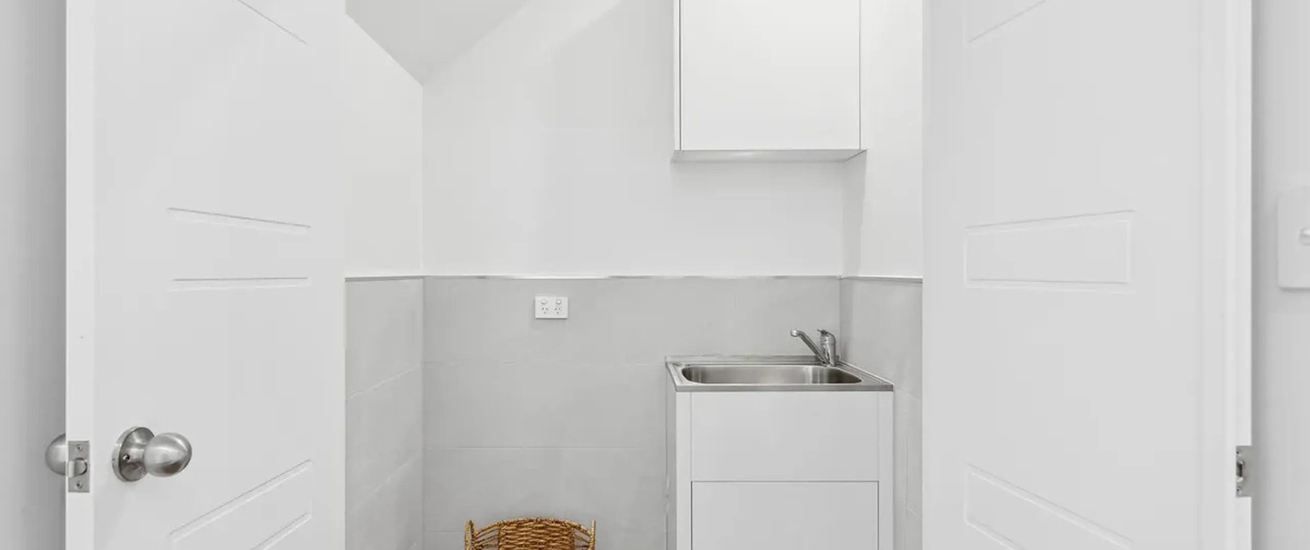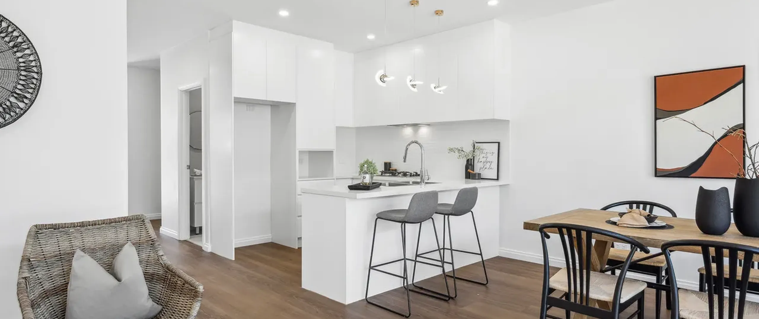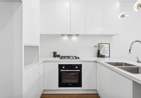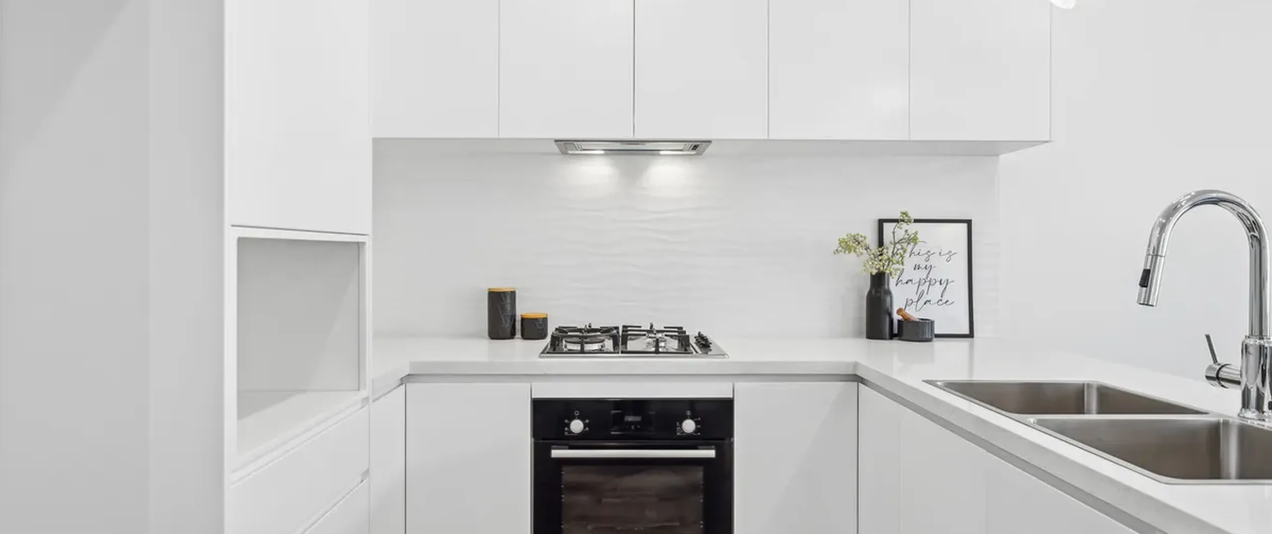 - Sleek white kitchen with gas cooking