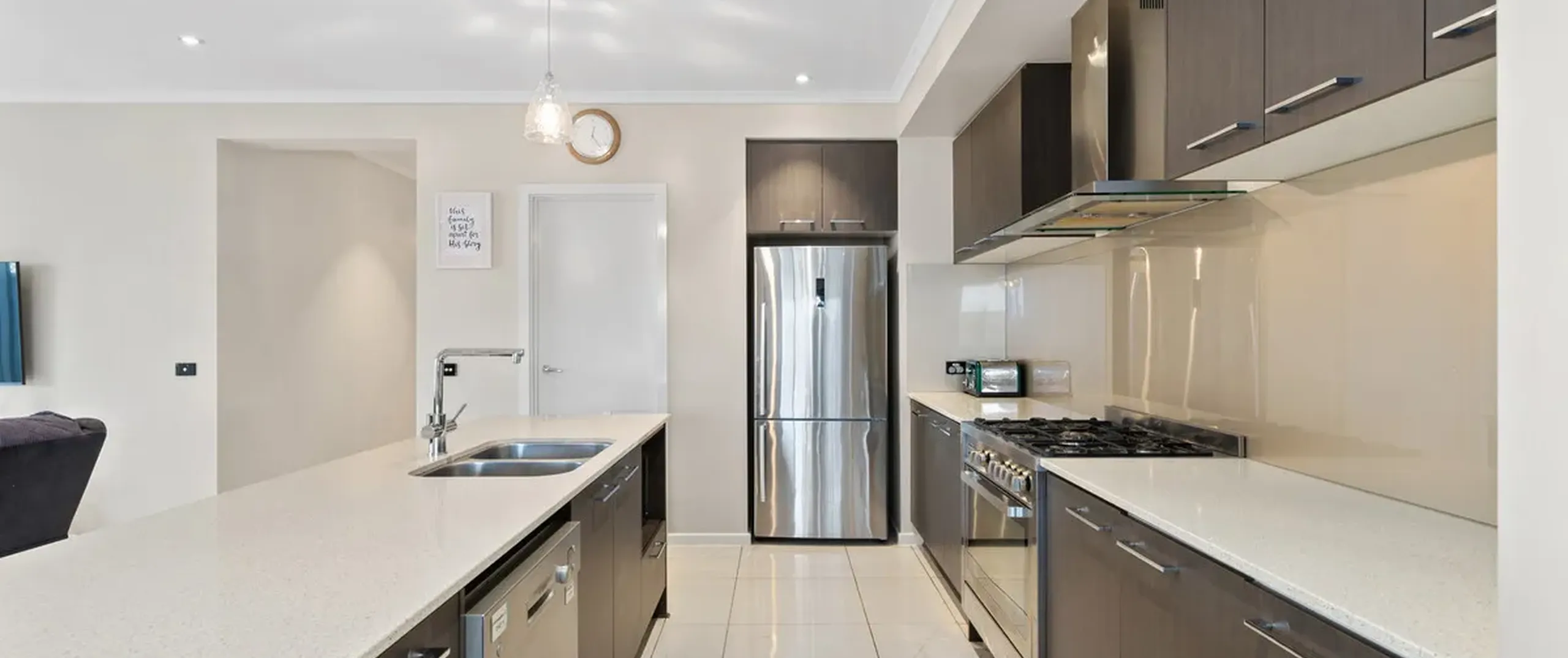 - Kitchen features quality stainless steel appliances, freestanding 900mm gas cooktop, dishwasher, stone benchtops and walk-in pantry