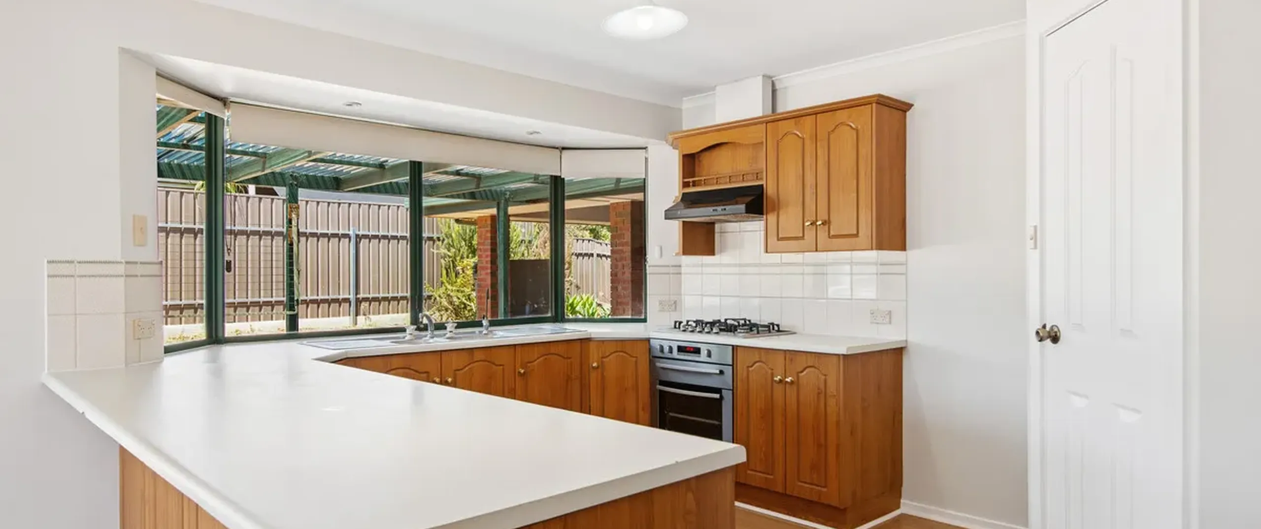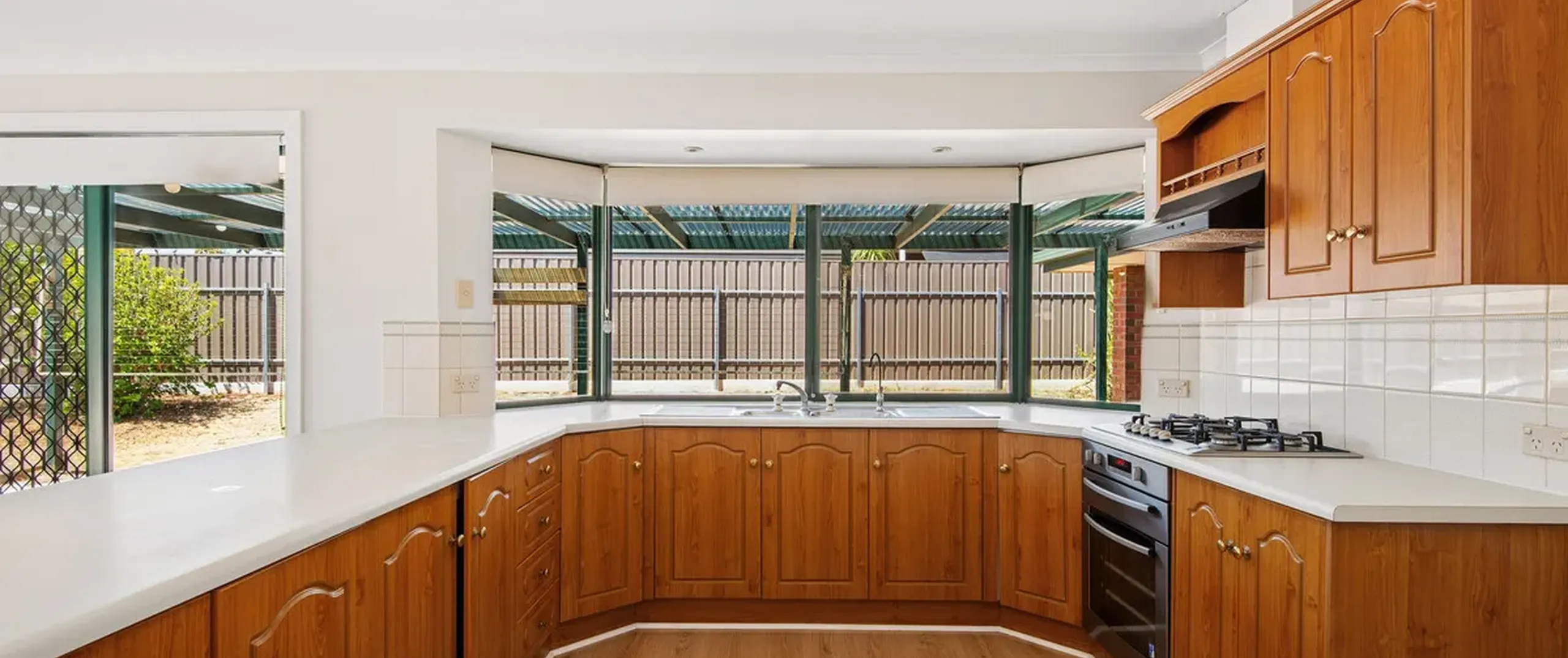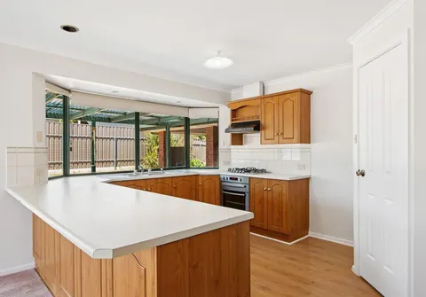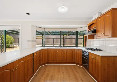 - Classic kitchen with timber cabinetry, timber-look flooring, gas cooktop, ample cupboard and bench space and breakfast bar