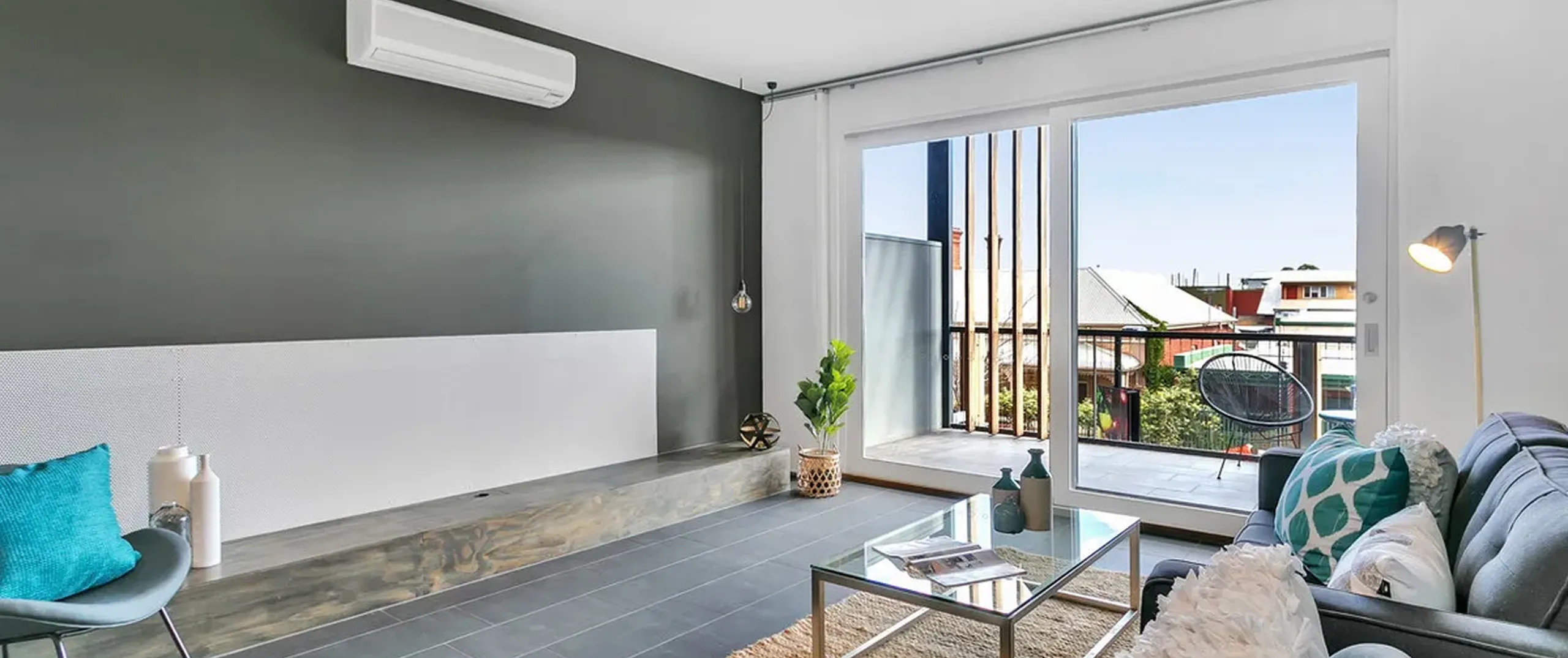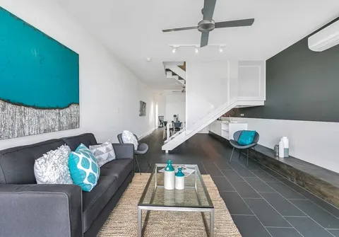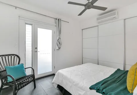 - Spacious, light-filled living area with ceiling fan and split system air conditioner