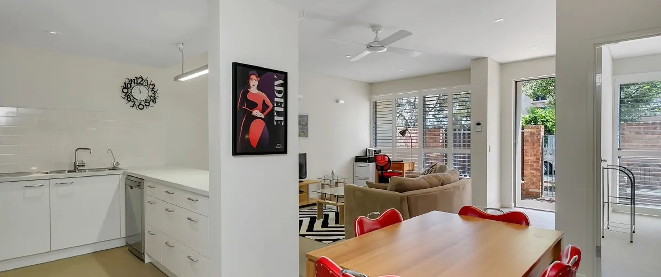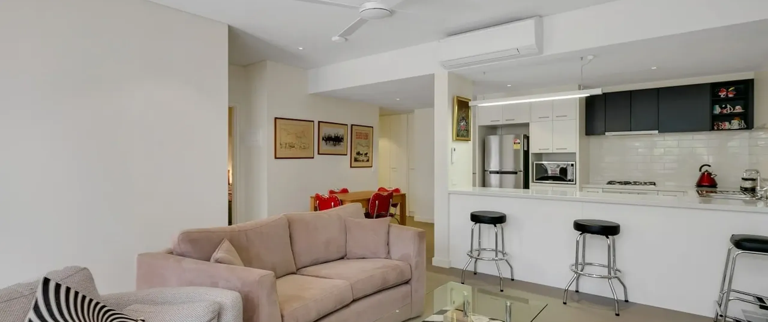 - Light filled lounge with split system air conditioner and ceiling fan