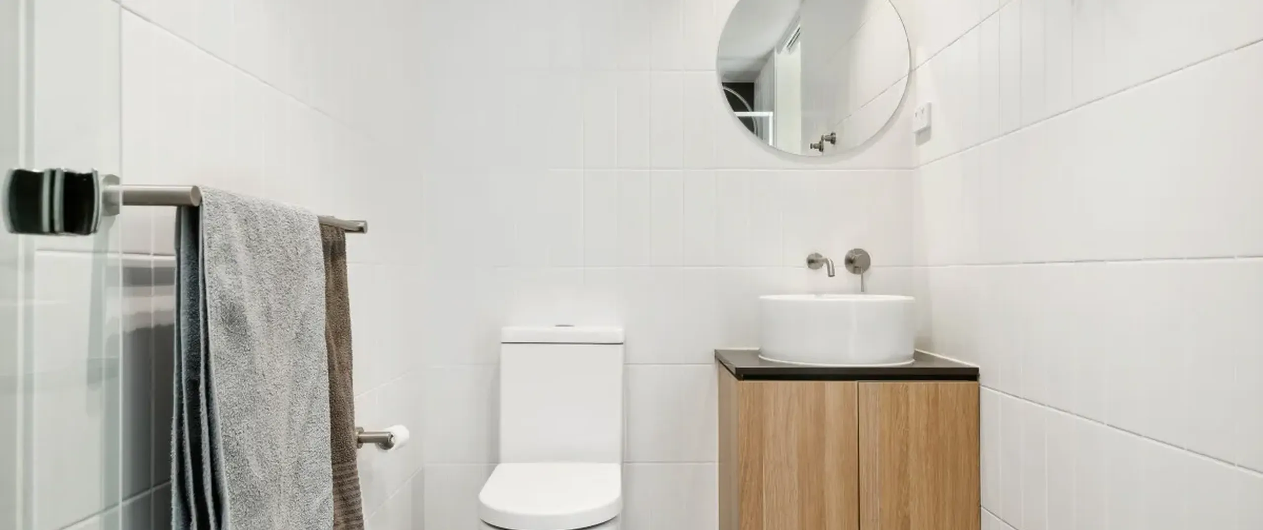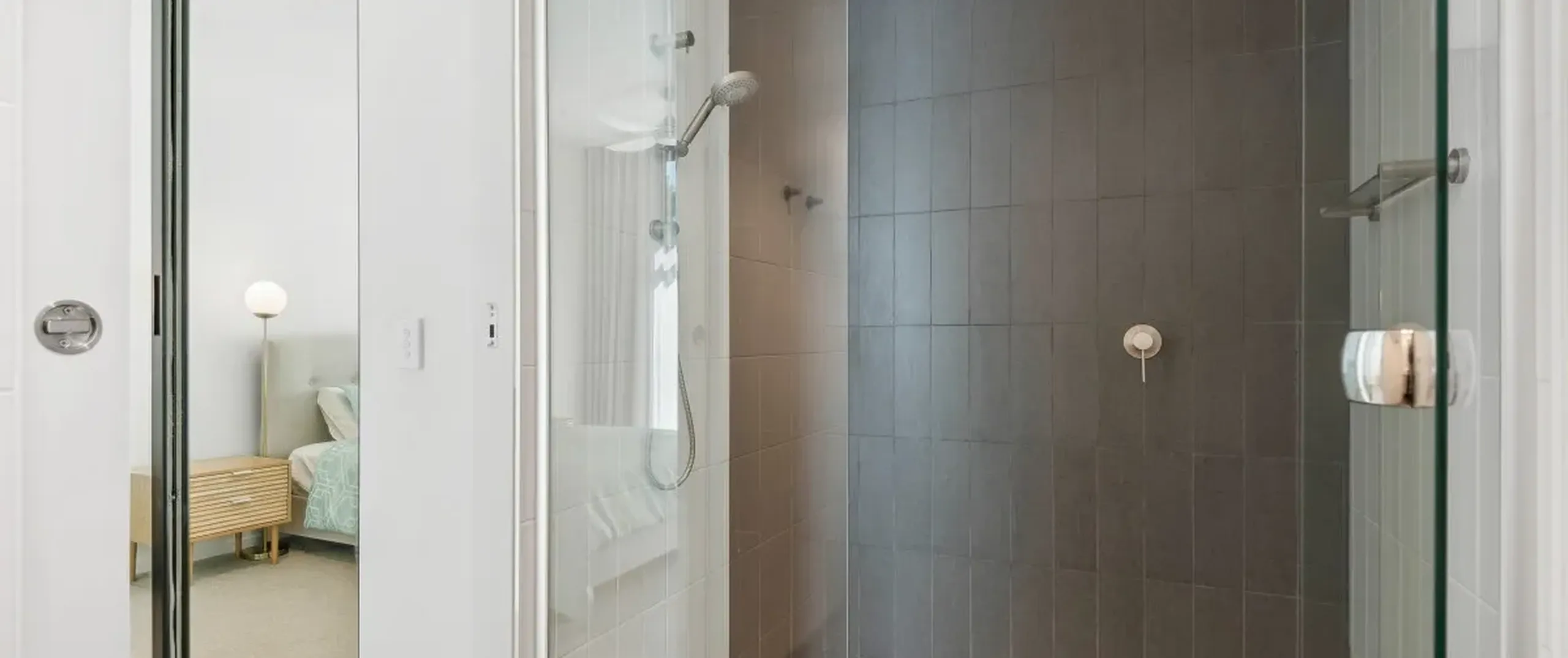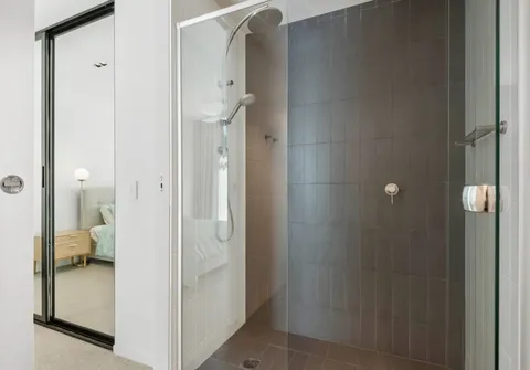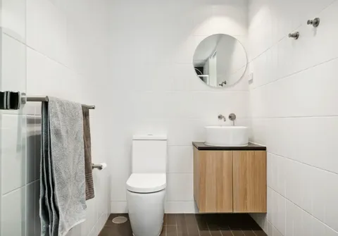 - Spacious shower cavity, floating timber vanity with a vessel sink