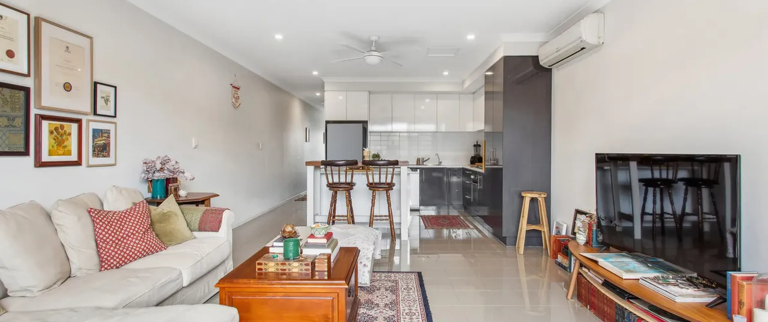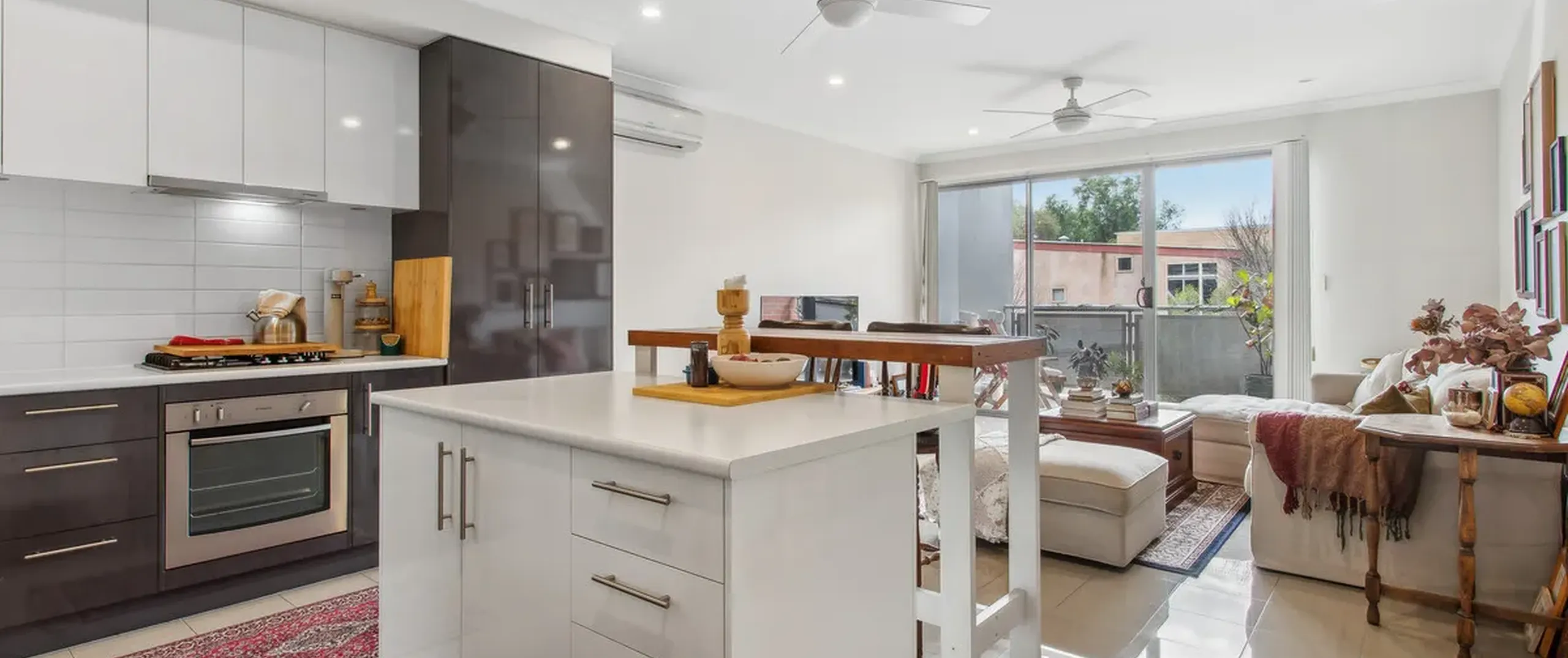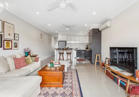 - Light-filled open plan living and kitchen area with two ceiling fans and split system air conditioner; connecting seamlessly to the balcony